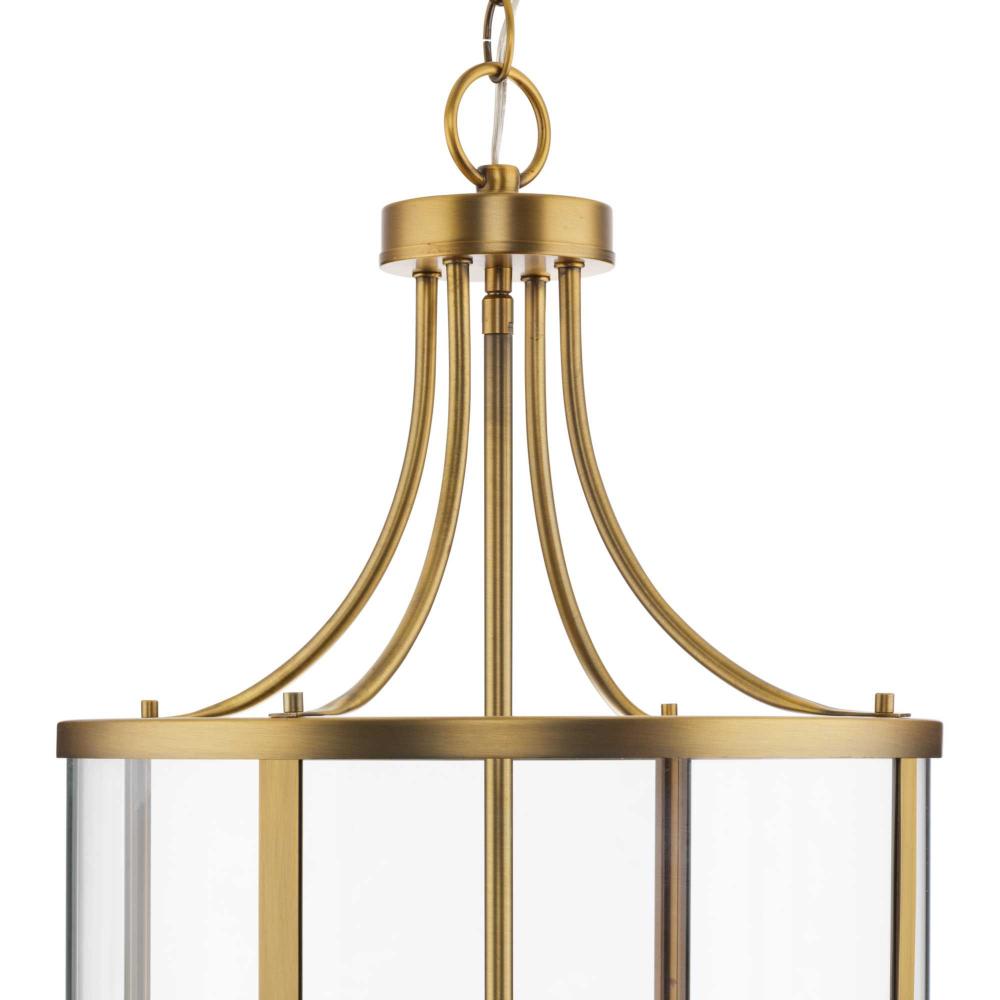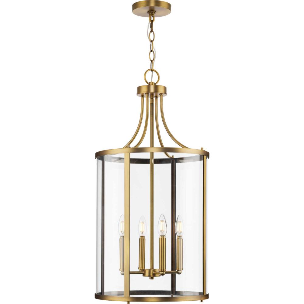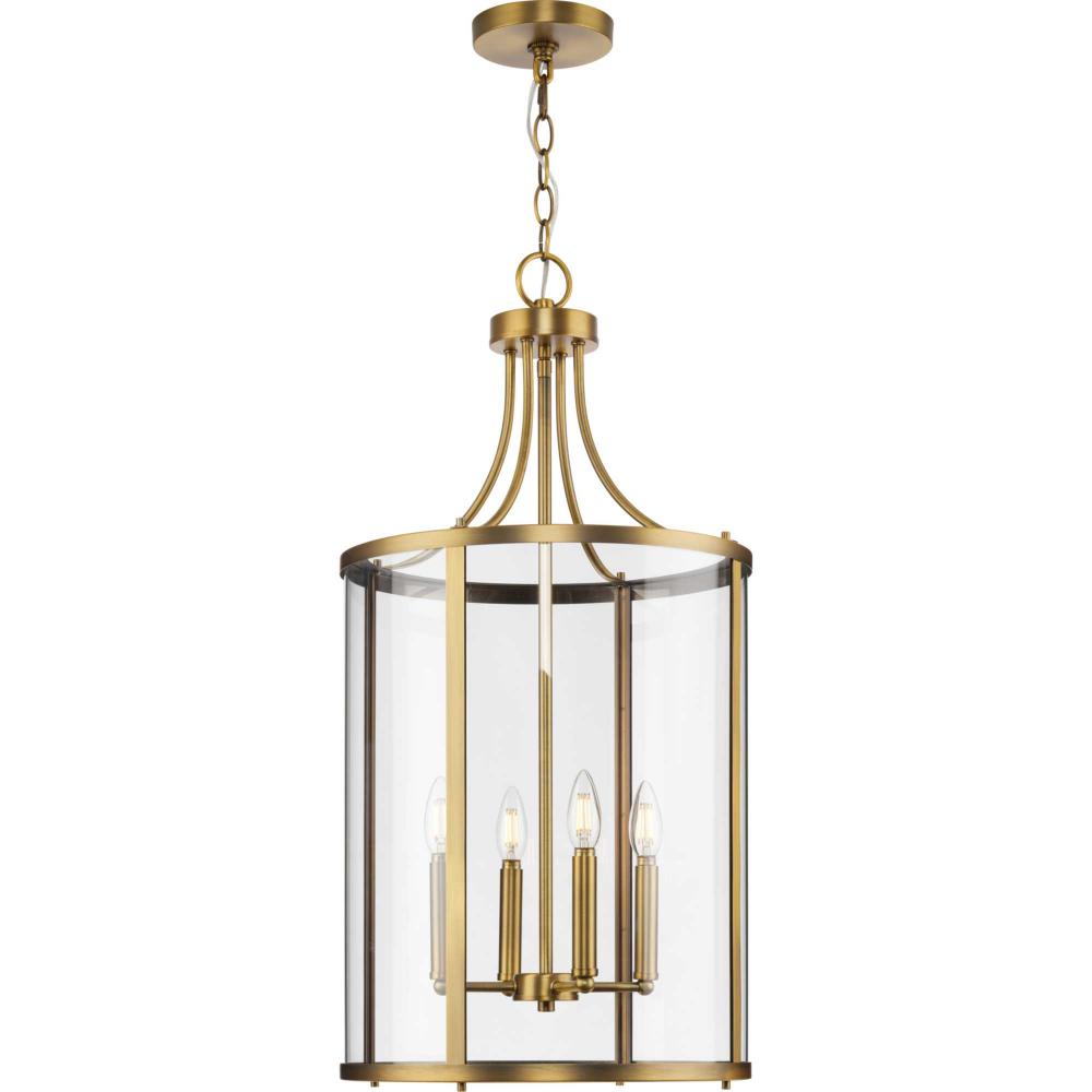 The fixture is coated with a gold-toned, vintage brass finish, adding a beautiful statement to halls and foyers