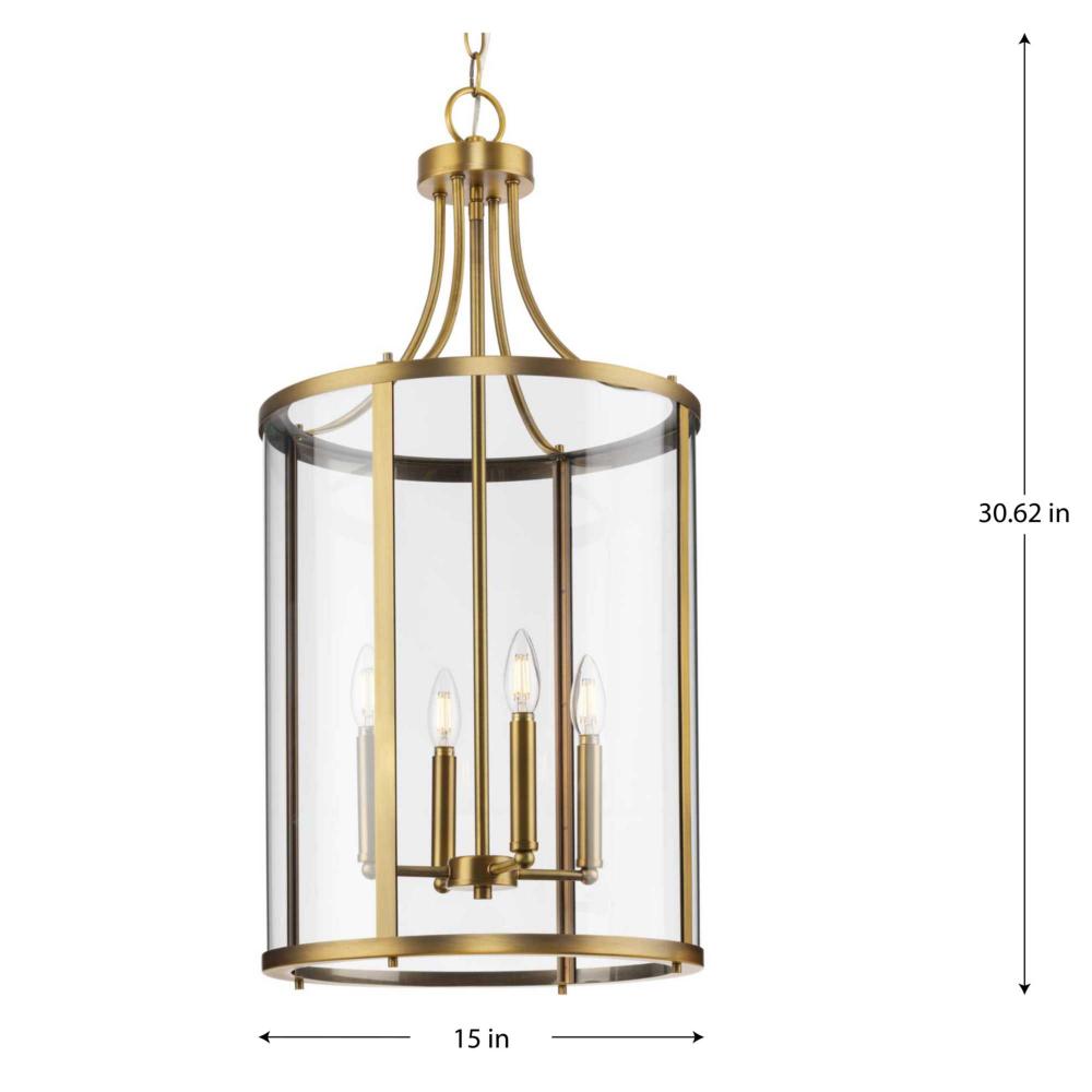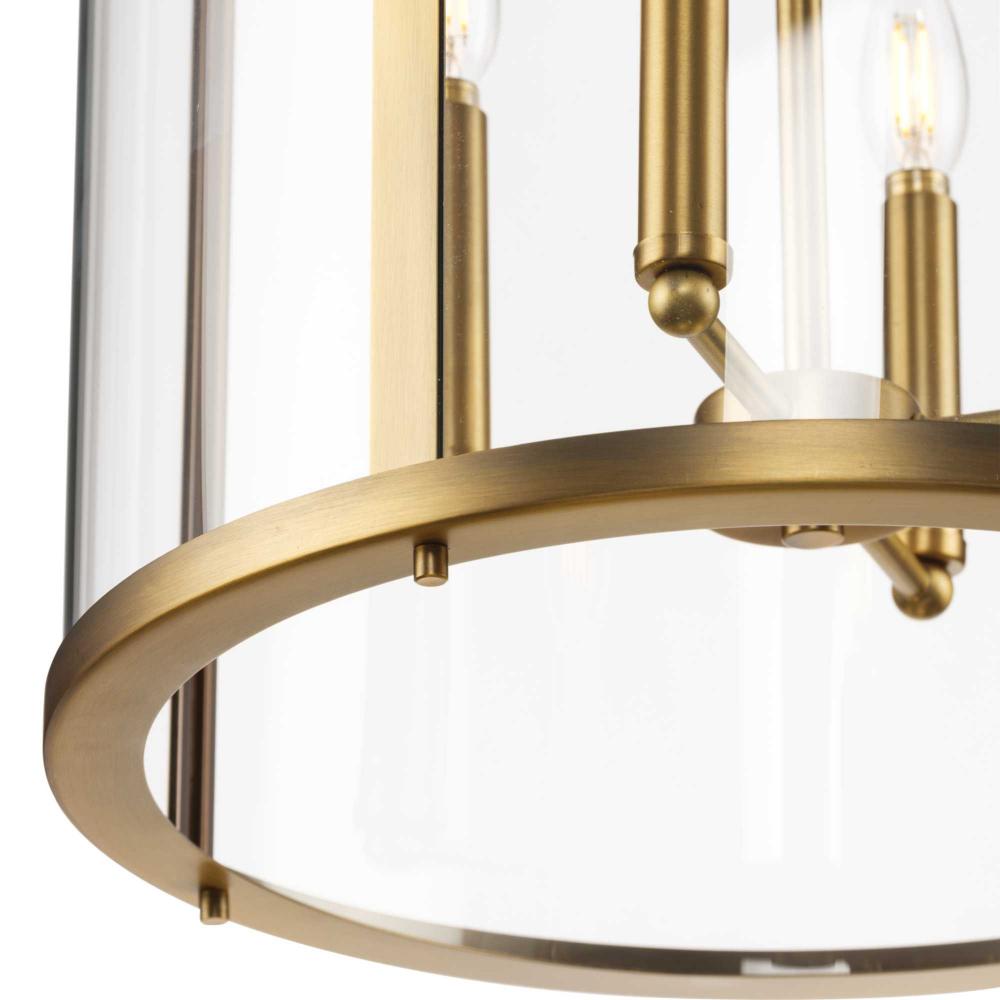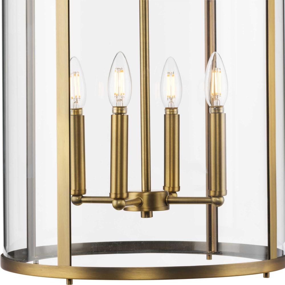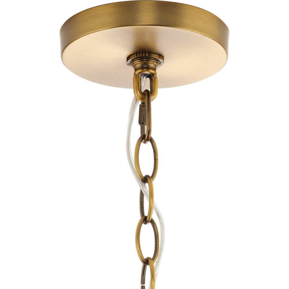 The fixture is coated with a gold-toned, vintage brass finish, adding a beautiful statement to halls and foyers