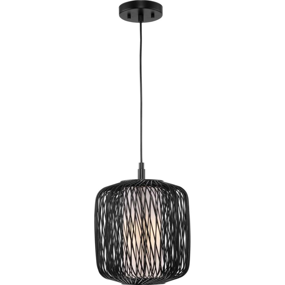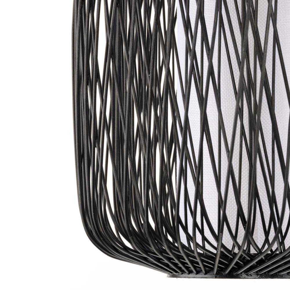 The pendant features a white linen fabric diffuser surrounded by a black rattan shade