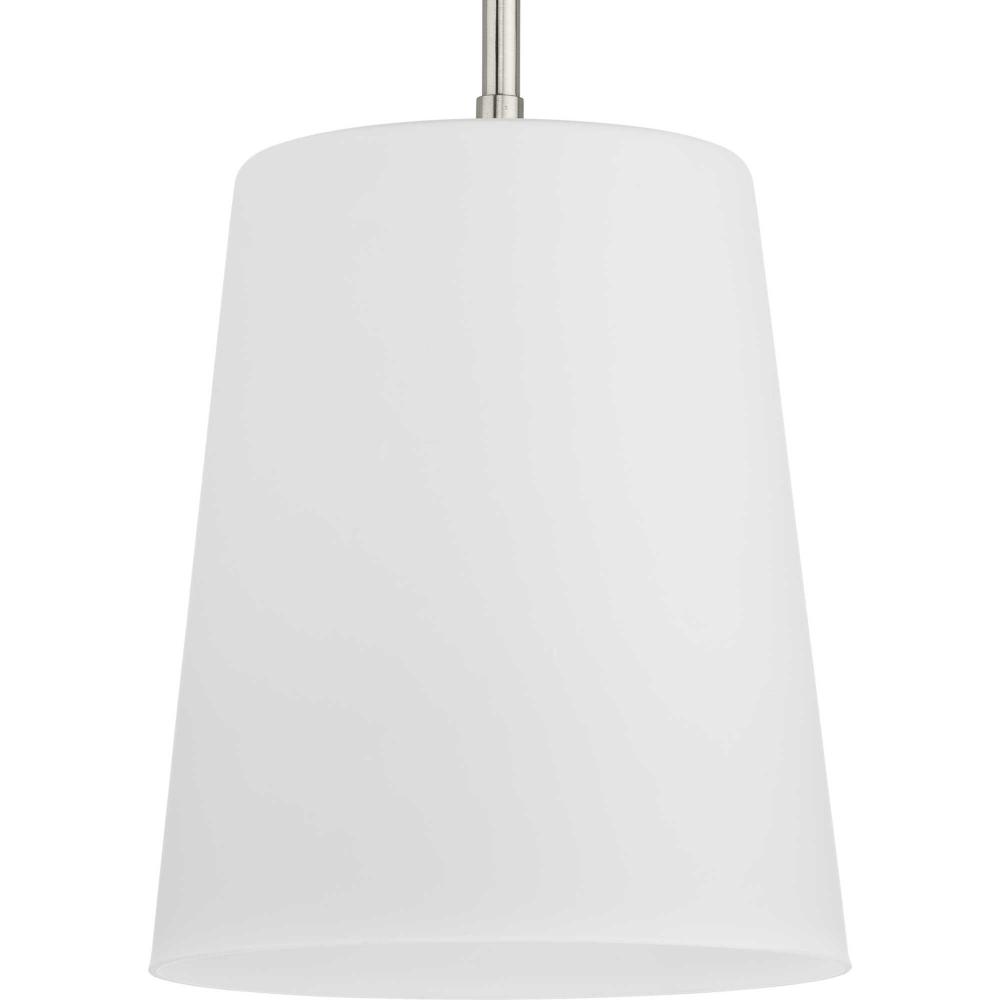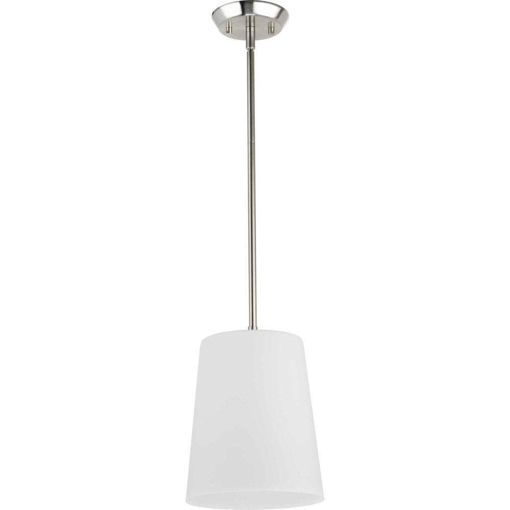 Elegant in its simplicity, the versatile Clarion pendant features an etched glass shade that embraces minimalist modernity and functional task lighting. The glass shade rests at the end of a sleek brushed nickel bar that attaches to the ceiling. Each light fixture has a swivel at its base that makes it perfect for installing on flat or angled ceilings.
