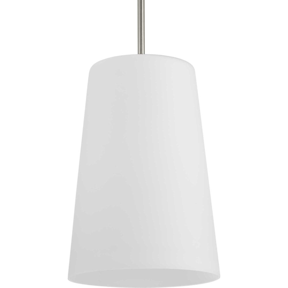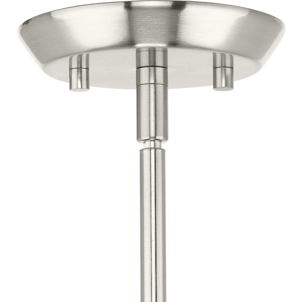 Elegant in its simplicity, the versatile Clarion pendant features an etched glass shade that embraces minimalist modernity and functional task lighting. The glass shade rests at the end of a sleek brushed nickel bar that attaches to the ceiling. Each light fixture has a swivel at its base that makes it perfect for installing on flat or angled ceilings.