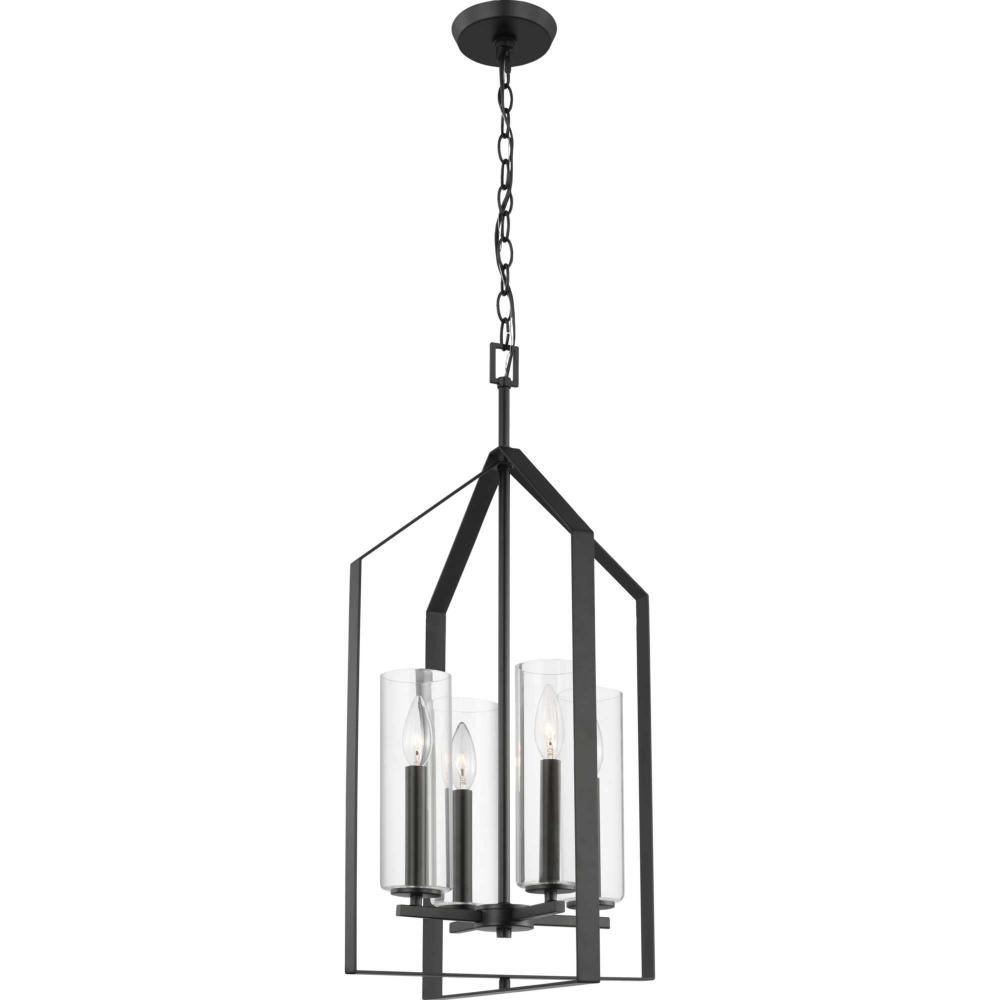 Elegantly extended, the Vertex foyer light is composed of angular forms to create a bold design that perfectly complements halls, foyers and kitchens in modern interiors. Its distinctive silhouette is coated in a matte black finish. A clear glass shade offers bright illumination to spaces below. Customize the light's hanging height to your ceiling using the Included 48 in. of chain for a variety of ceiling heights and sloped ceilings.