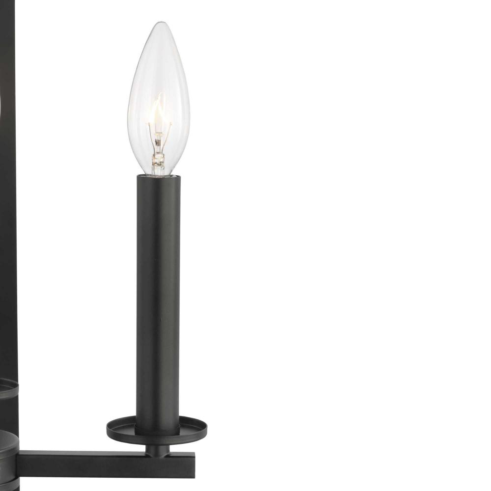 Four candelabra bases within this open design casts bright illumination to spaces below.