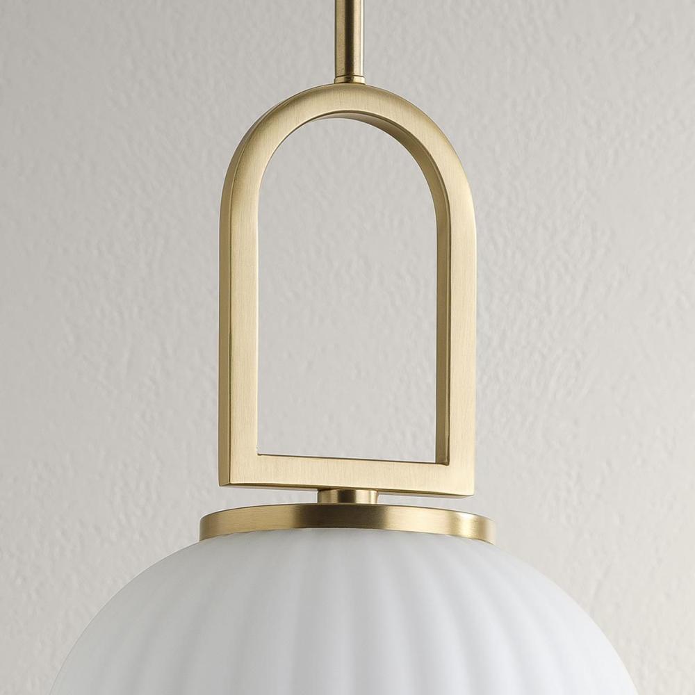 The Stanza Pendant Light merges timeless design with architectural finesse, showcasing a beautifully fluted glass shade with a softly rounded top that evokes vintage charm. Its distinctive arched metal loop, elegantly attached to a streamlined stem and fin