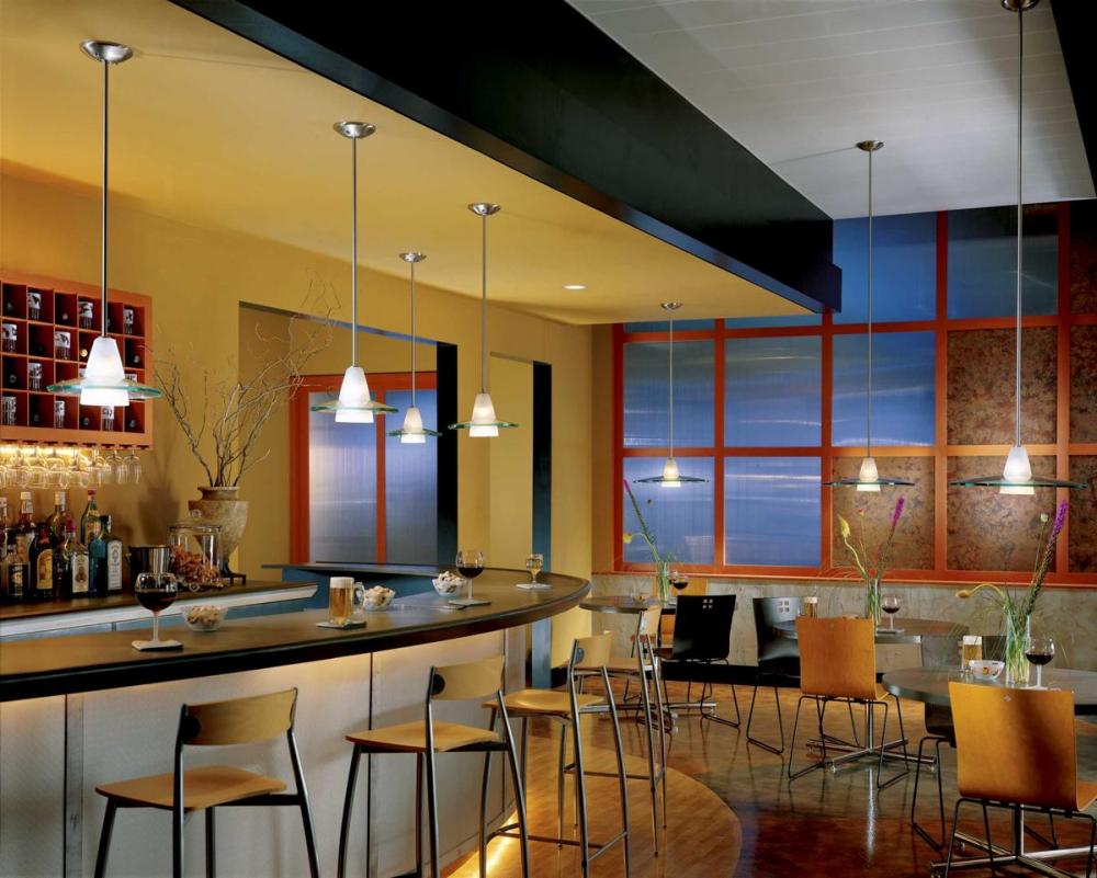 Contemporary stem-hung one-light mini-pendant with an etched glass cone supporting a heavy curved clear glass shade. Canopy adjusts to sloped ceilings up to 45 degrees w/ 358 degree rotation.