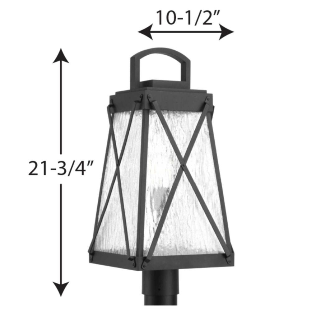 A cottage-inspired outdoor post lantern collection with a tapered cage. Creighton features clear water glass clear and Black finish. The frame's linear details are riveted to enhance mechanical detailing of the fixture. Fits 3" post (order separately). Wall, post and hanging lantern options available.