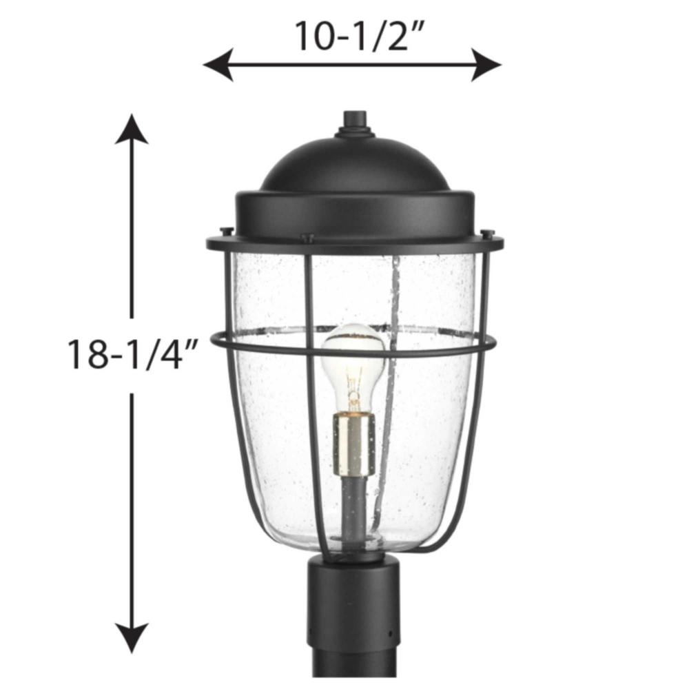 A nautical-inspired collection;Ideal for a variety of exteriors, including Coastal, Transitional and Urban Industrial settings;Textured Black finish with clear seeded glass feature a hint of brushed nickel on the interior;Post lantern uses one 100 watt max