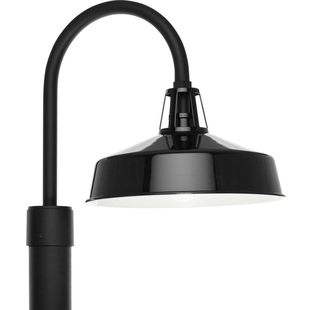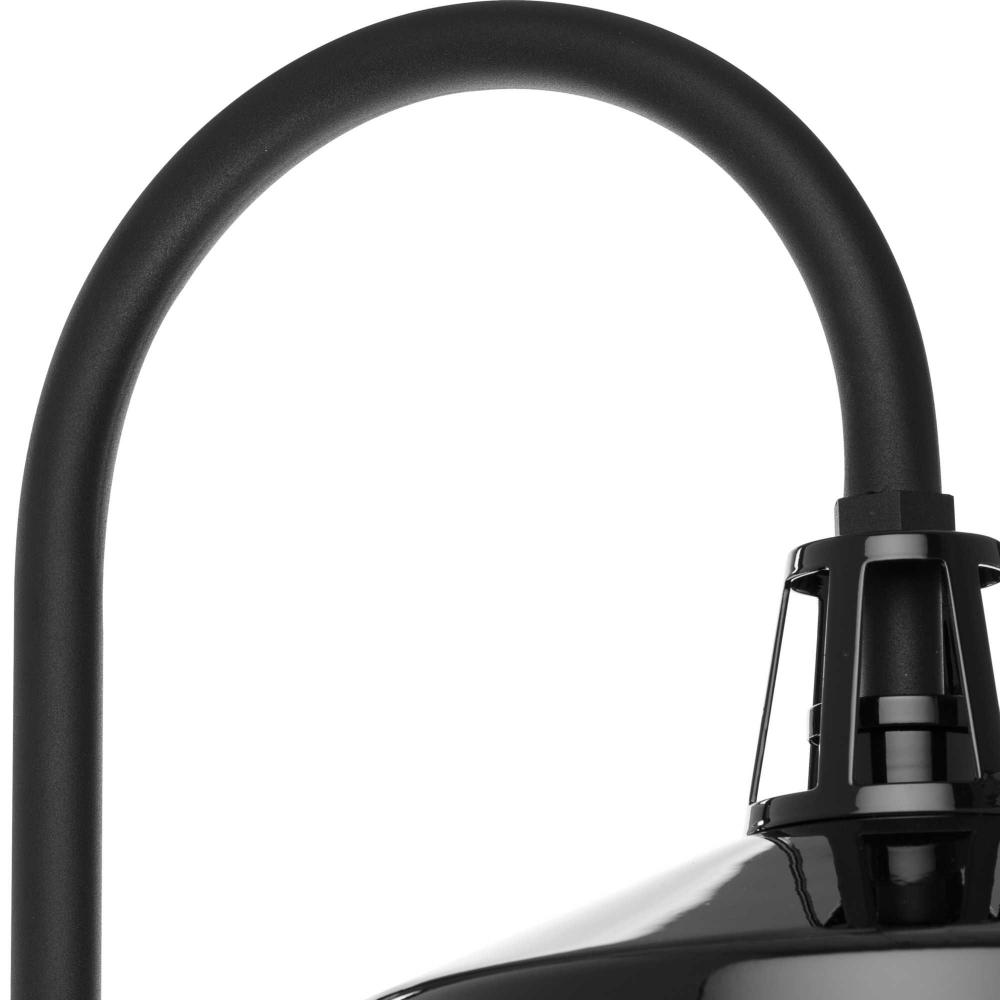 A black gooseneck arm gives a burst of personality to this traditional metal warehouse shade
