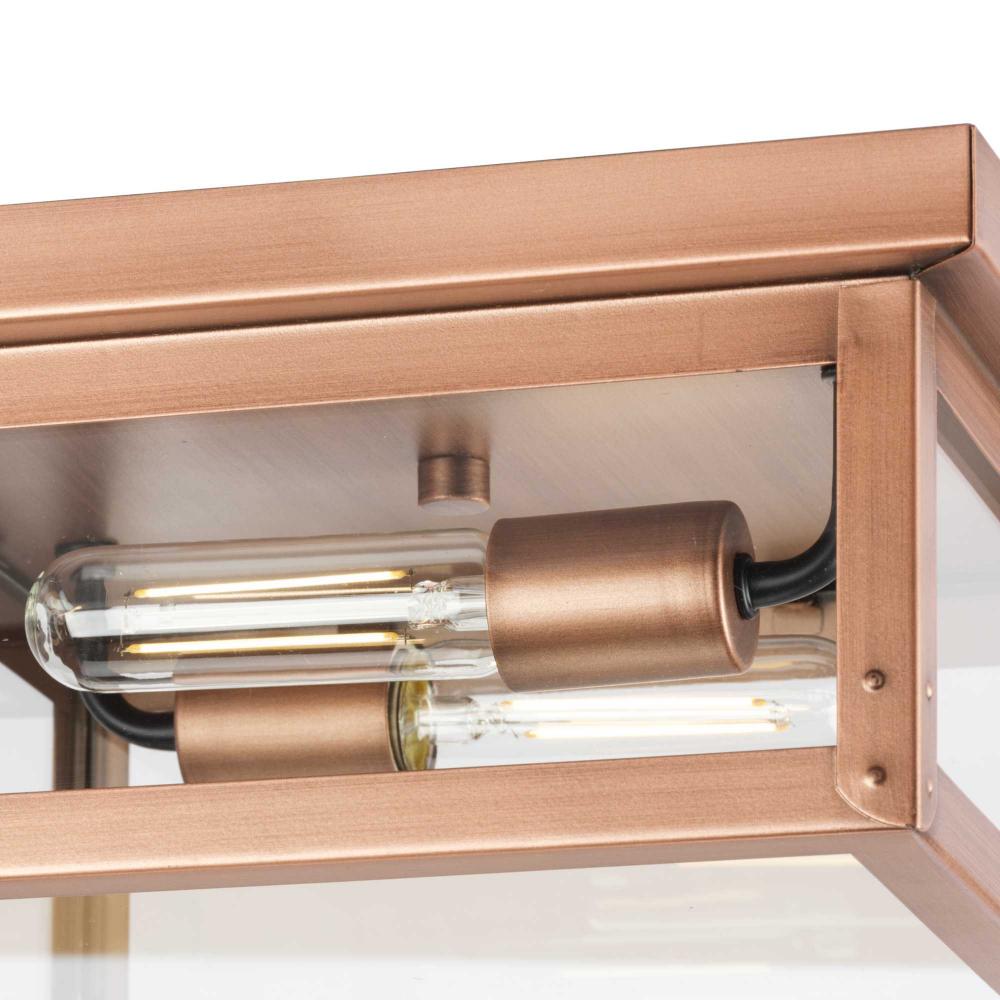 The light is coated in an antique copper finish, highlighting the flat clear glass panels and strong mechanical detail