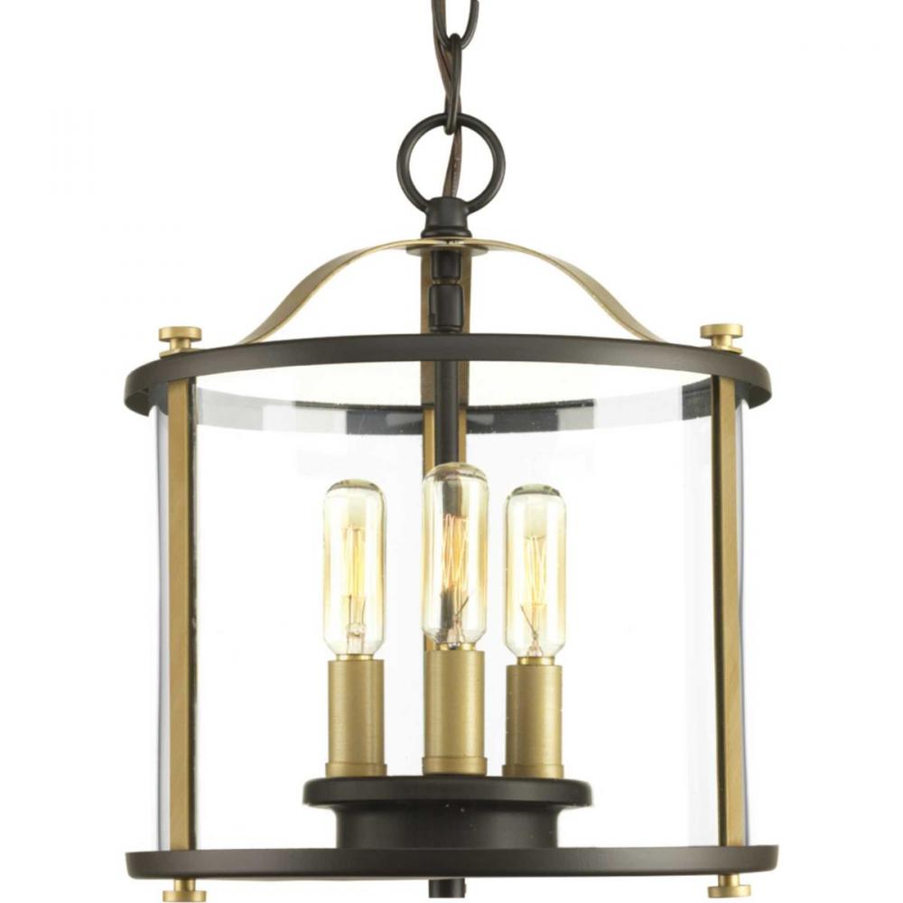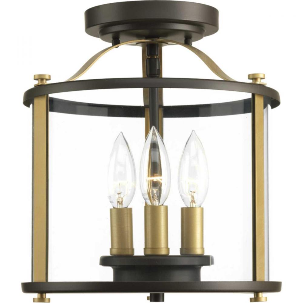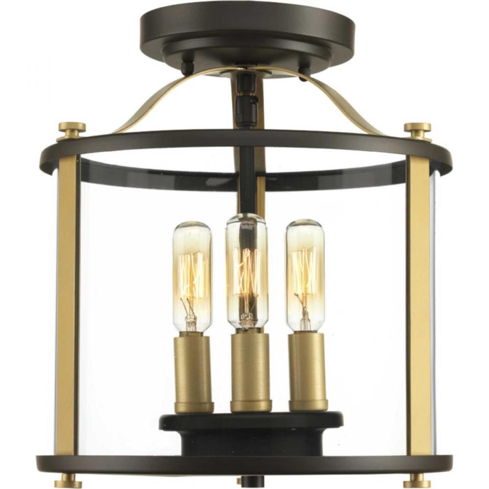 Squire three light semi-flush convertible lantern features a classic traditional profile with clean, modern metal fittings. The Antique Bronze finish is accented with contrasting Vintage Brass metallic elements, the cylindrical frame is comprised of a clear glass diffuser.