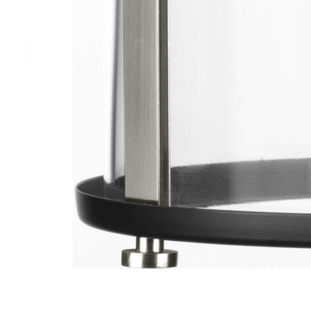 Profile features clean, modern metal fittings;Lantern is accented with contrasting metallic elements;A cylindrical frame is comprised of a clear glass diffuser;Black finish with Stainless Steel accents.