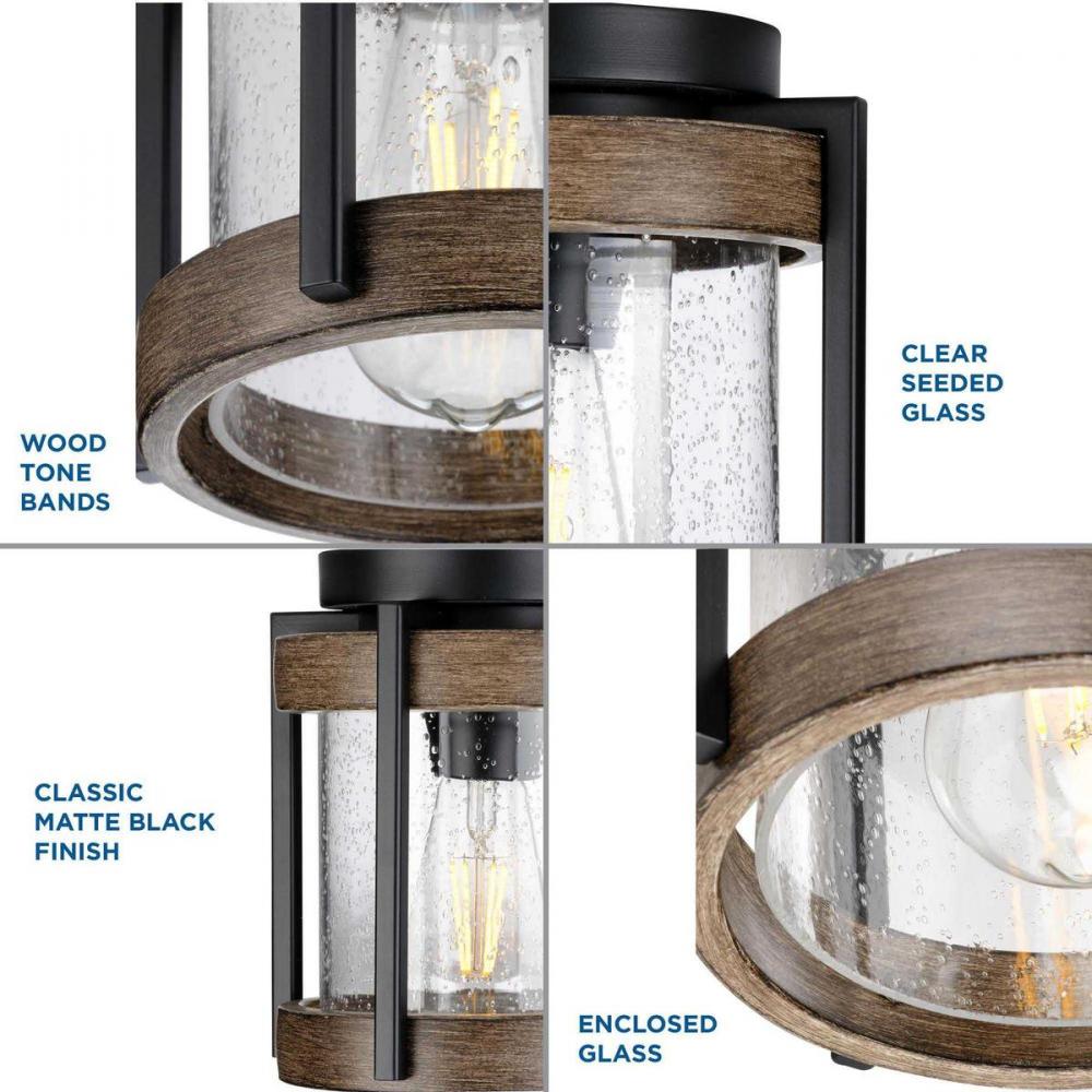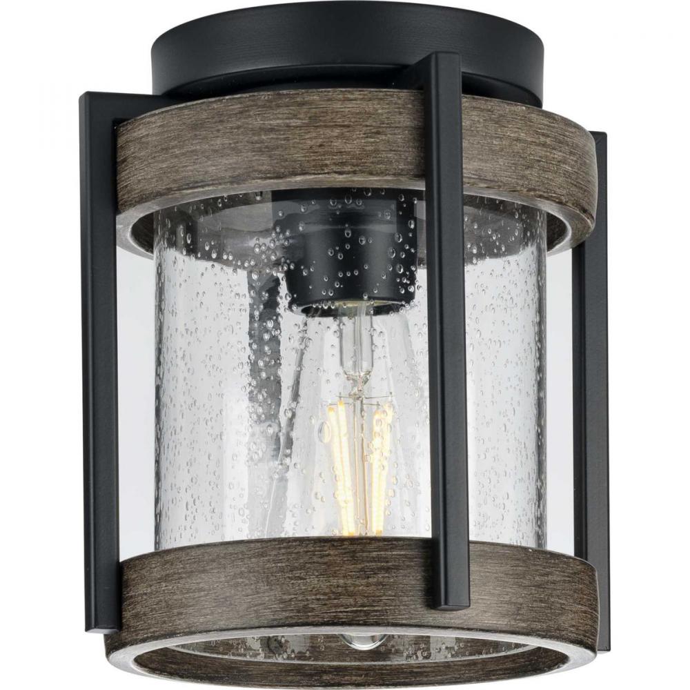 Blend rustic style with modern elegance with the Whitmire Collection. Wood-tone bands accent a clear seeded glass shade for beautiful illumination. A classic matte black frame and circular ceiling plate complete the outdoor flush mount's charming design.