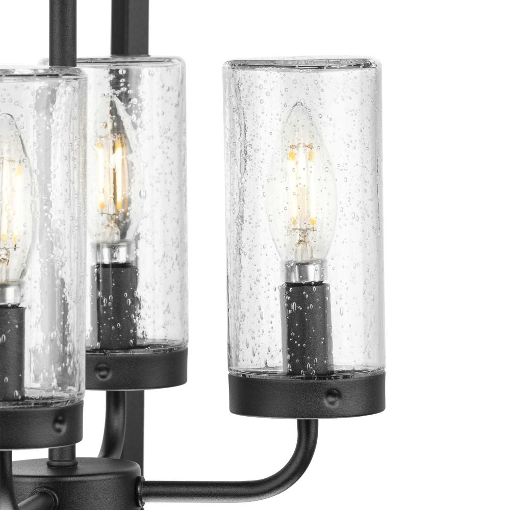 The Chapel Collection presents an overscale open metal frame finished in textured black that provides a stunning focal point for covered outdoor living areas in transitional, modern farmhouse and modern craftsman homes. A seeded glass candelabra is nestled within, casting warm, welcome illumination at a front entrance, over islands and tables in patios, porches and outside entertaining spaces.Customize the hanging height with the included 60 in. of chain for a variety of ceiling heights and it can be used on sloped ceilings. It is cULus damp location listed for use where water may be present, with a one-year warranty to guarantee your complete satisfaction. Progress Lighting products are designed for exceptional quality, reliability, and functionality.