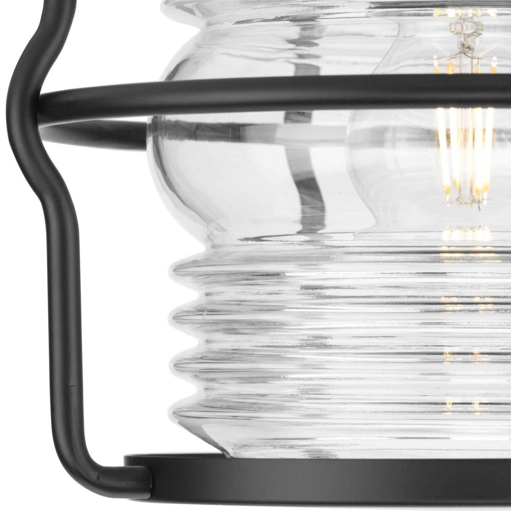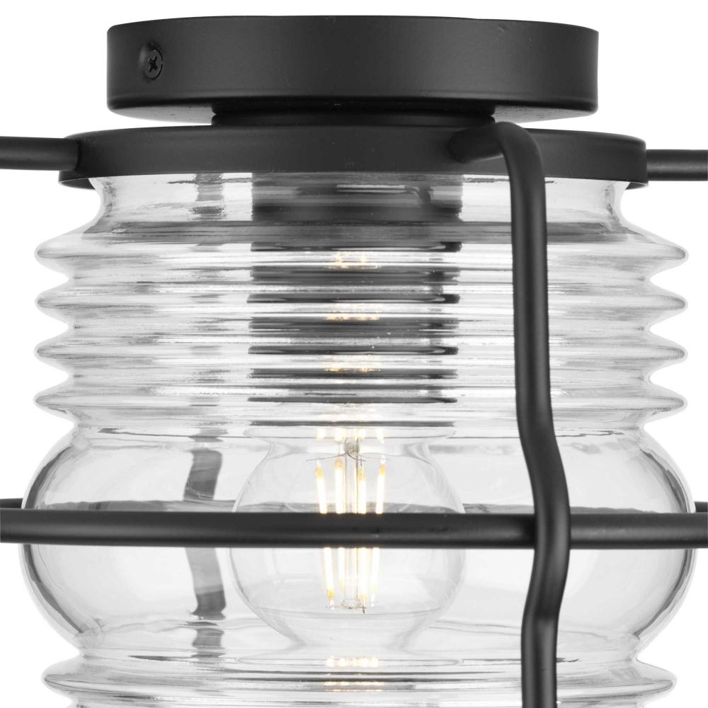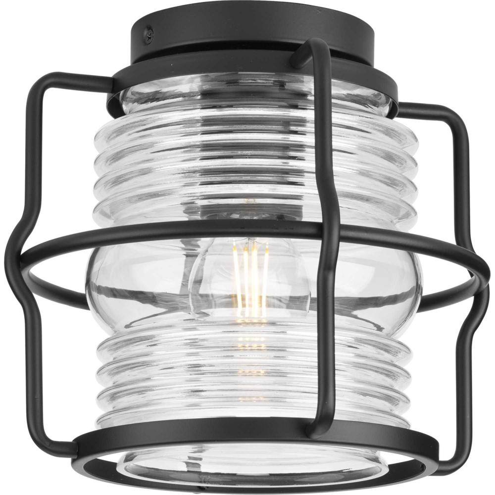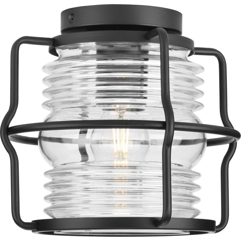 Redefine modern coastal style with the Keegan Collection, whose breezy silhouette takes a cue from a lighthouse. A ribbed clear glass, Fresnel-style shade is nestled within a protective wire frame finished in crisp matte black, creating a beacon in the night.Its nautical style is ideal for indoor or outdoor use in coastal and urban industrial patios, porches, laundry and mud rooms, hallways and foyers and other areas where a unique ceiling mount light is desired.It is cULus damp location listed for use where water may be present, with a one-year warranty to guarantee your complete satisfaction. Progress Lighting products are designed for exceptional quality, reliability, and functionality.