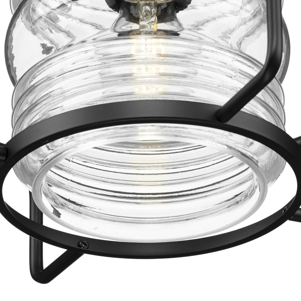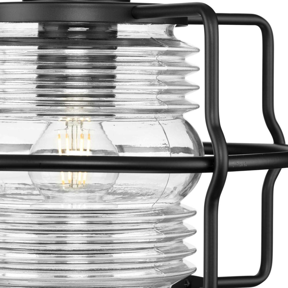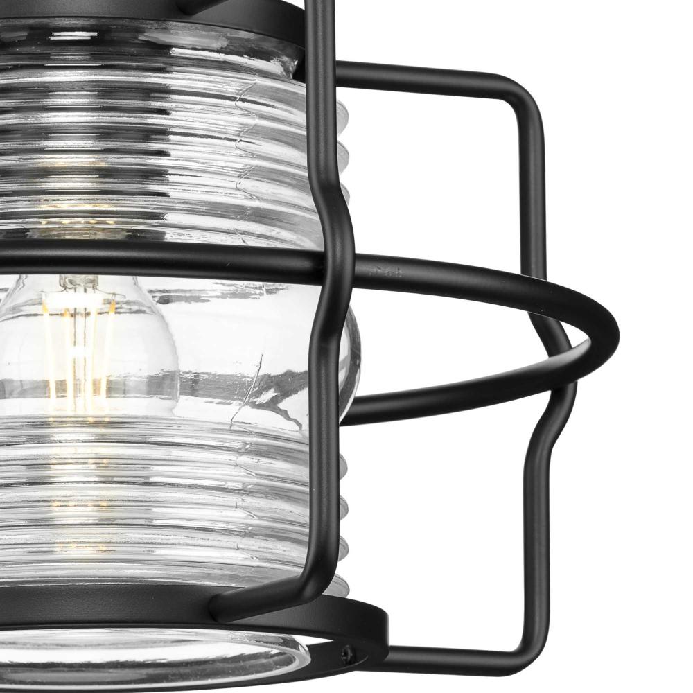 Redefine modern coastal style with the Keegan Collection, whose breezy silhouette takes a cue from a lighthouse. A ribbed clear glass, Fresnel-style shade is nestled within a protective wire frame finished in crisp matte black, creating a beacon in the night.Its nautical style is ideal for indoor or outdoor use in coastal and urban industrial patios, porches, laundry and mud rooms, over islands and table and other areas where a unique hanging light is desired.It is cULus damp location listed for use where water may be present, with a one-year warranty to guarantee your complete satisfaction. This versatile fixture includes 60 in. of chain for a variety of ceiling heights and can be used on a sloped ceilings. Progress Lighting products are designed for exceptional quality, reliability, and functionality.