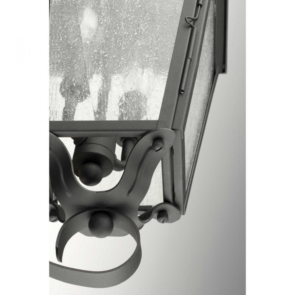 Black finish.;Updated classic style.;Seeded glass panels with traditional detailing.;Easy access for relamping.