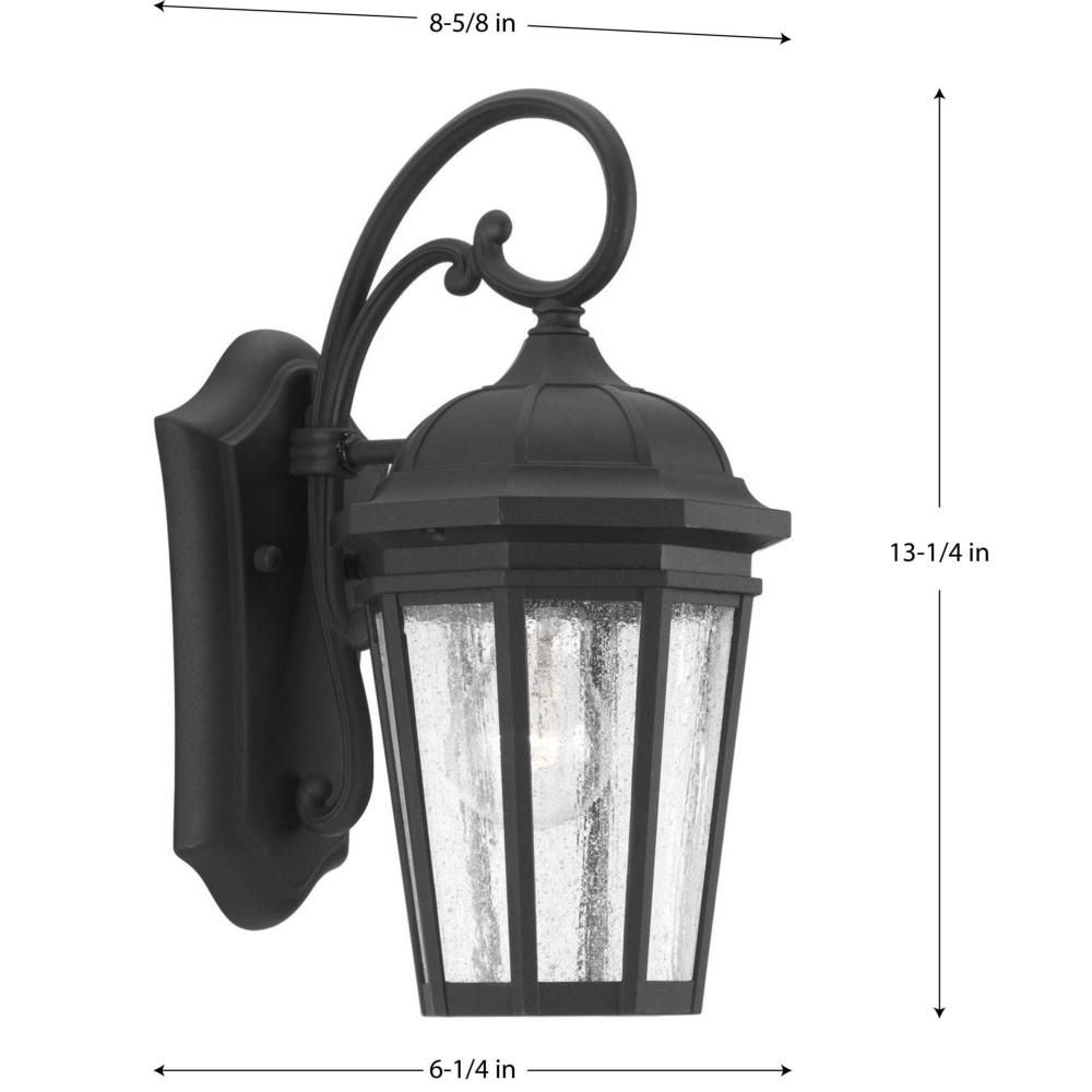 The one-light small wall lantern in the Verdae collection offers traditional styling for a variety of exteriors. Classic and formal clear seeded glass complements a Black finish. Open bottom design allows easy access to replace lamps. Finished in timeless black.