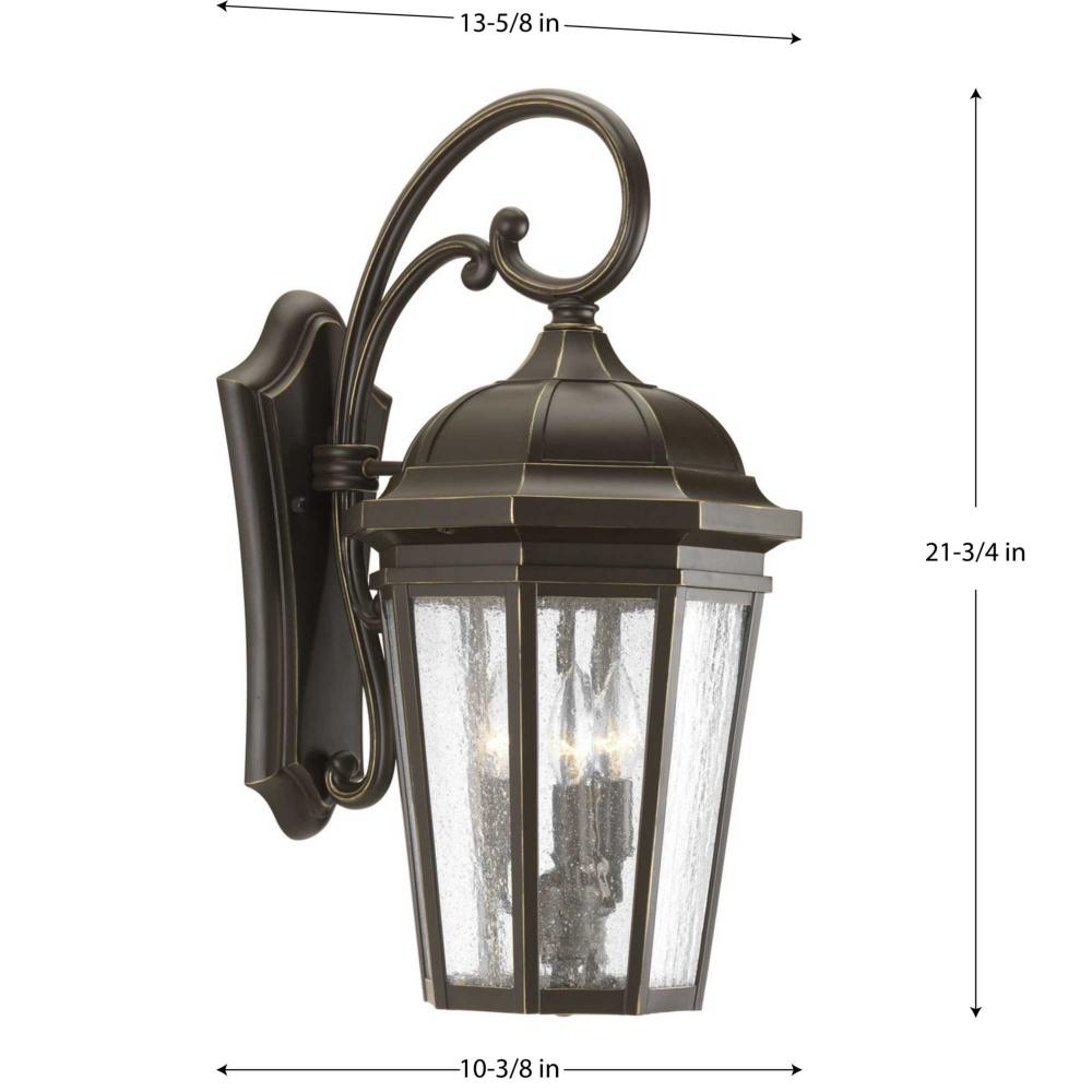 The three-light wall lantern in the Verdae collection offers traditional styling for a variety of exteriors. Classic and formal clear seeded glass complements an Antique Bronze finish. Open bottom design allows easy access to replace lamps.