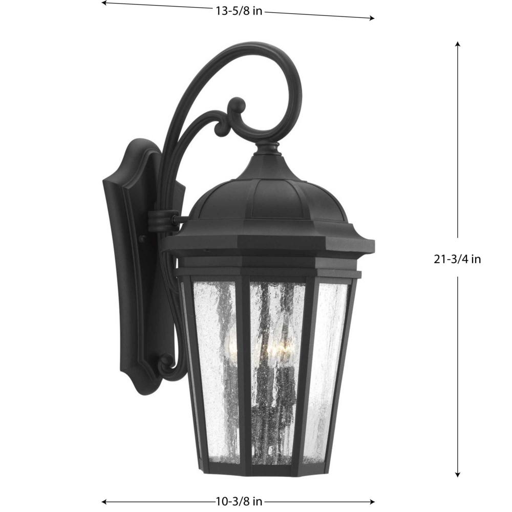 The three-light wall lantern in the Verdae collection offers traditional styling for a variety of exteriors. Classic and formal clear seeded glass complements a Black finish. Open bottom design allows easy access to replace lamps.