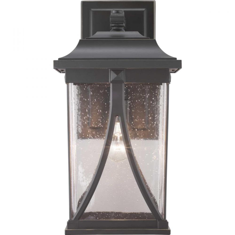 Distinctive forms with ancient roots are featured in this large wall lantern from the Abbott Collection. Transparency, depth and dimension are all on display to highlight the clear seeded glass and sweeping details within the Antique Bronze frame.