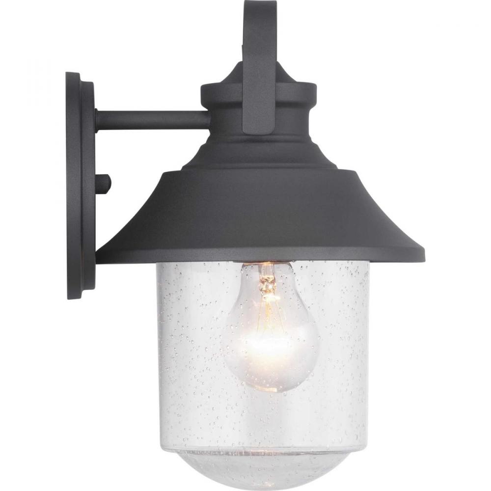 Featuring nautical influences, Weldon delivers a medium wall lantern ideal for Farmhouse or Transitional architecture designs. Curved clear seeded glass is topped with an ample roof in Black.