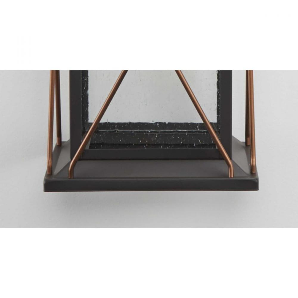 Clear seeded glass panes add an extra pop of rustic personality.;An antique bronze finish complemented with antique copper accents adds warmth and character as the lantern infuses your home with gentle illumination.;A rustic X-brace design decorates each s