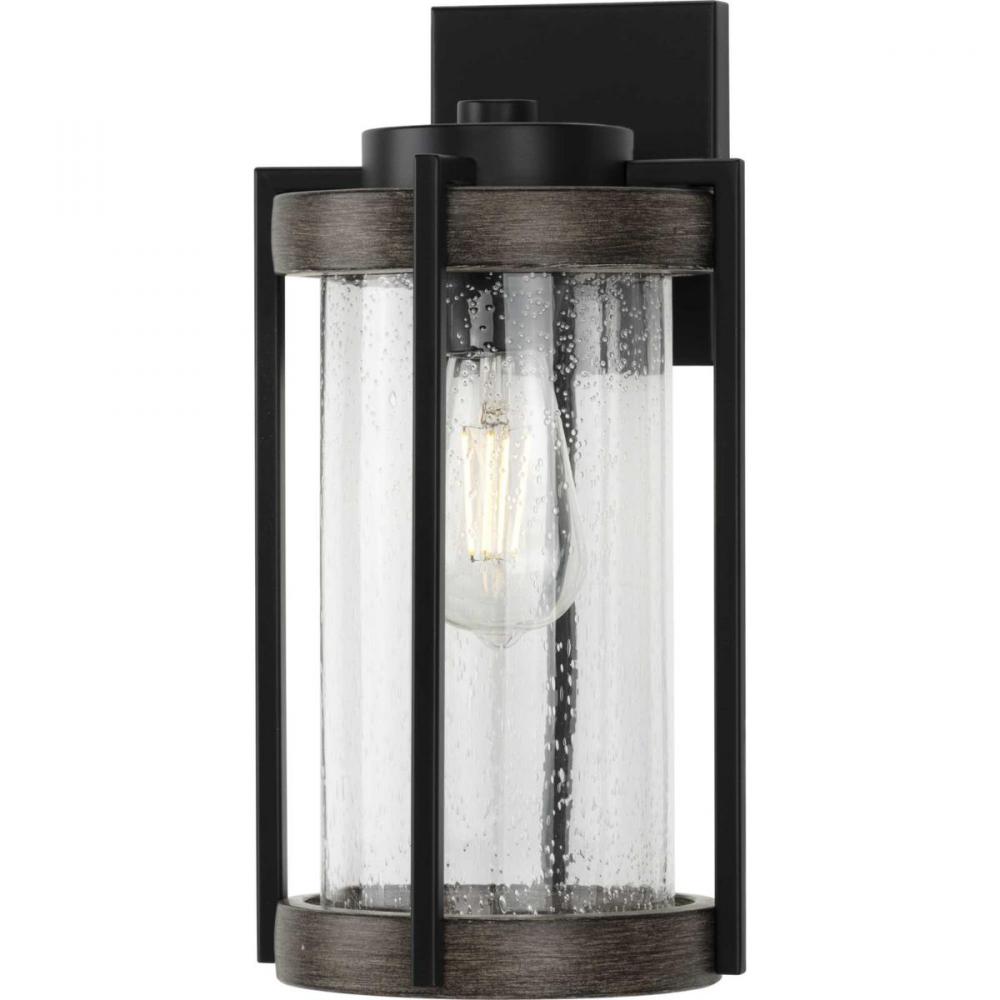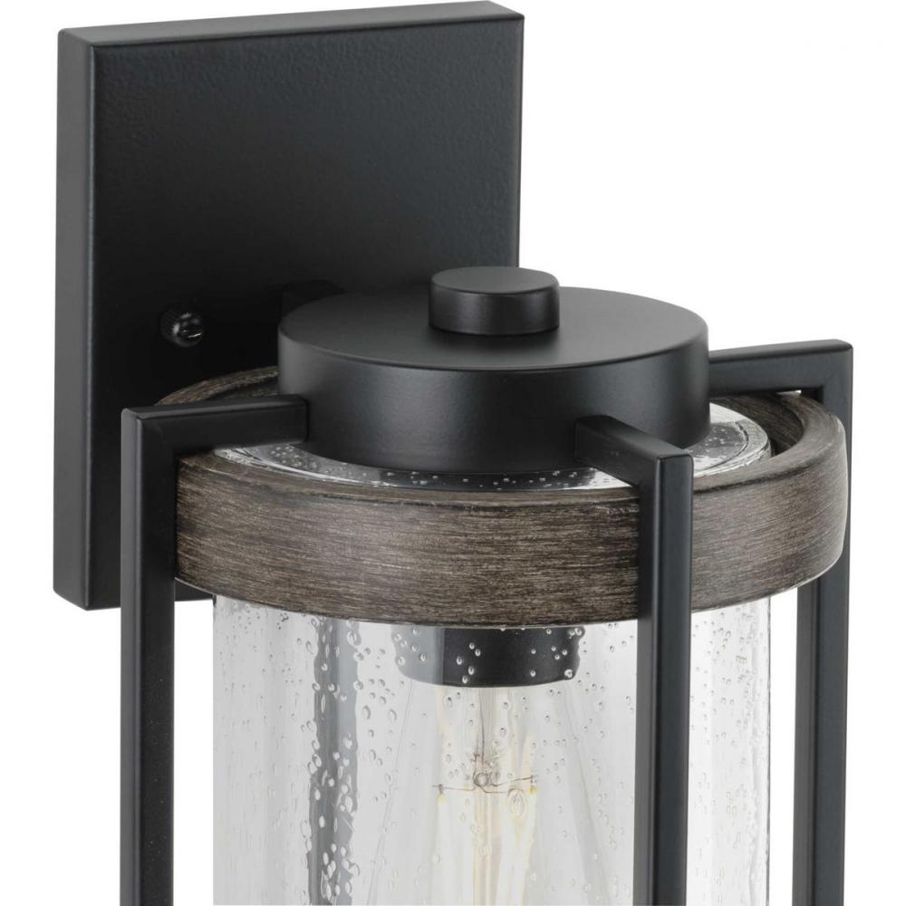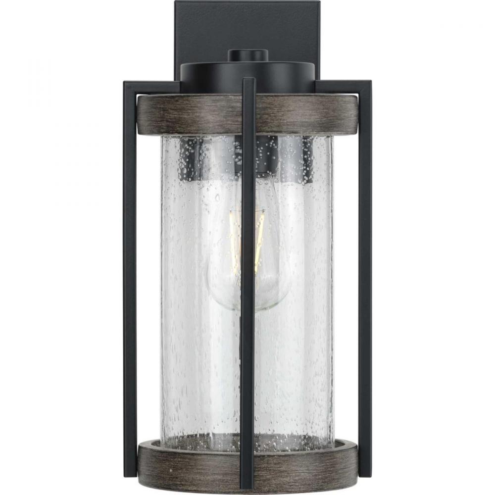 Blend rustic style with modern elegance with the Whitmire Collection. Wood-tone bands accent a clear seeded glass shade for beautiful illumination. A classic matte black frame and rectangular backplate complete the outdoor wall lantern's charming design.