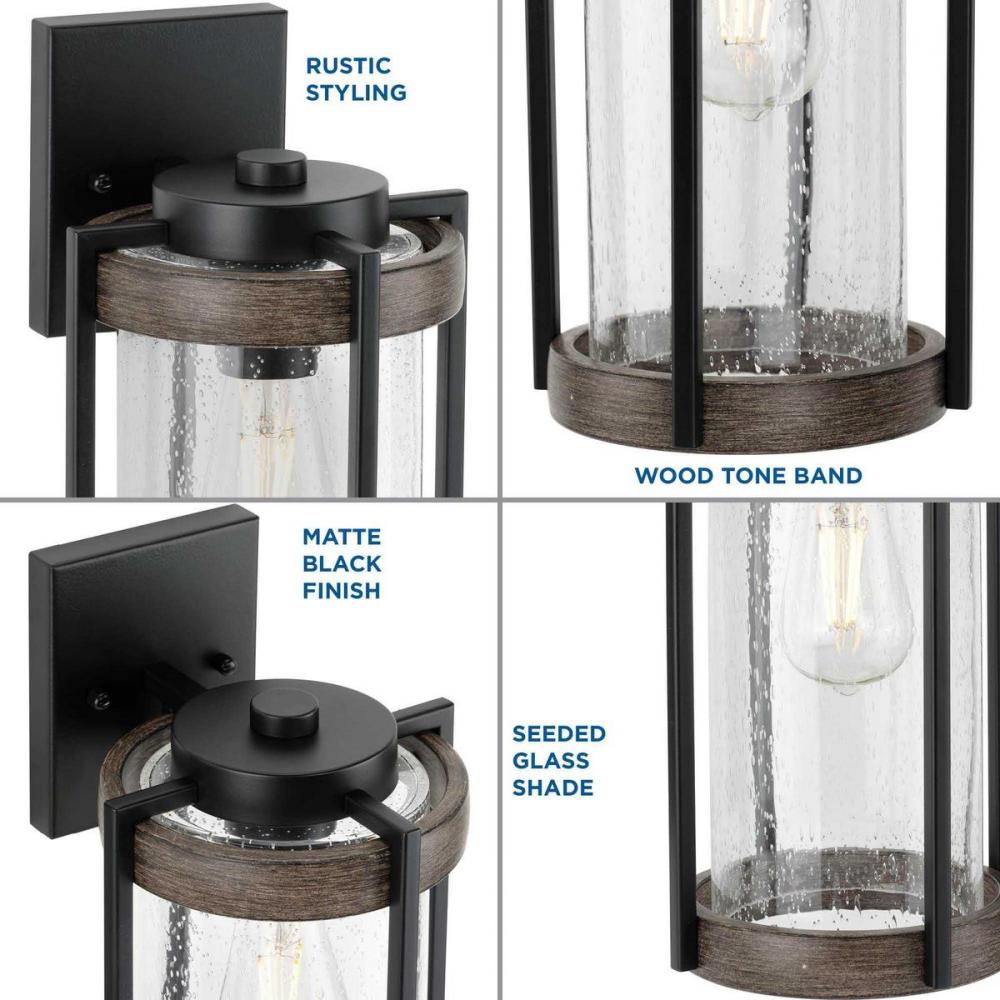 Ideal for a porch, patio, deck, garage, barn, entryway, foyer, or bedroom;Perfect for farmhouse and rustic style settings;Classic matte black finish with aged oak accents;Cylindrical clear seeded glass;Includes installation instructions and mounting hardwa