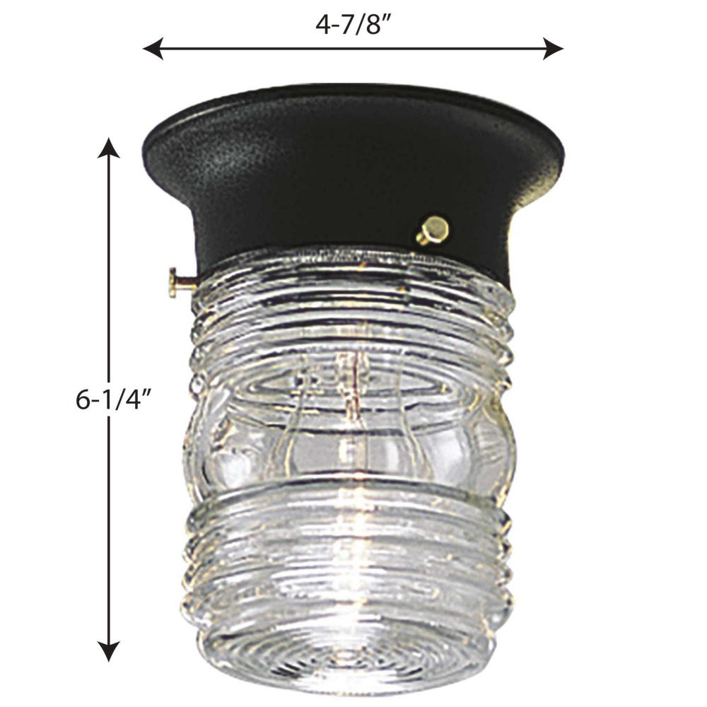 An outdoor "jelly jar" utility flush mount featuring a black powder-coated finish and clear marine glass. The fixture is wet location listed and ideal for outdoor spaces. The glass shape is a reminder of the old-fashioned jelly jars.