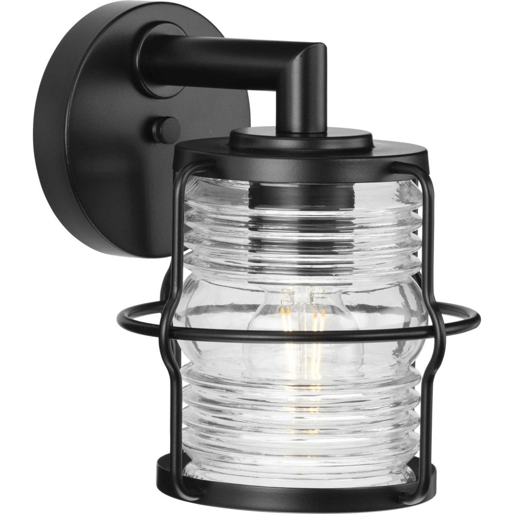 Redefine modern coastal style with the Keegan Collection, whose breezy silhouette takes a cue from a lighthouse. A ribbed clear glass, Fresnel-style shade is nestled within a protective wire frame finished in crisp matte black, creating a beacon in the night.Its nautical style is ideal for indoor or outdoor use in coastal and urban industrial patios, porches, laundry and mud rooms, in bathrooms and other areas where a unique wall light is desired.It is cULus wet location listed for use where water may be present, with a one-year warranty to guarantee your complete satisfaction. This versatile fixture includes 60 in. of chain for a variety of ceiling heights and can be used on a sloped ceilings. Progress Lighting products are designed for exceptional quality, reliability, and functionality.