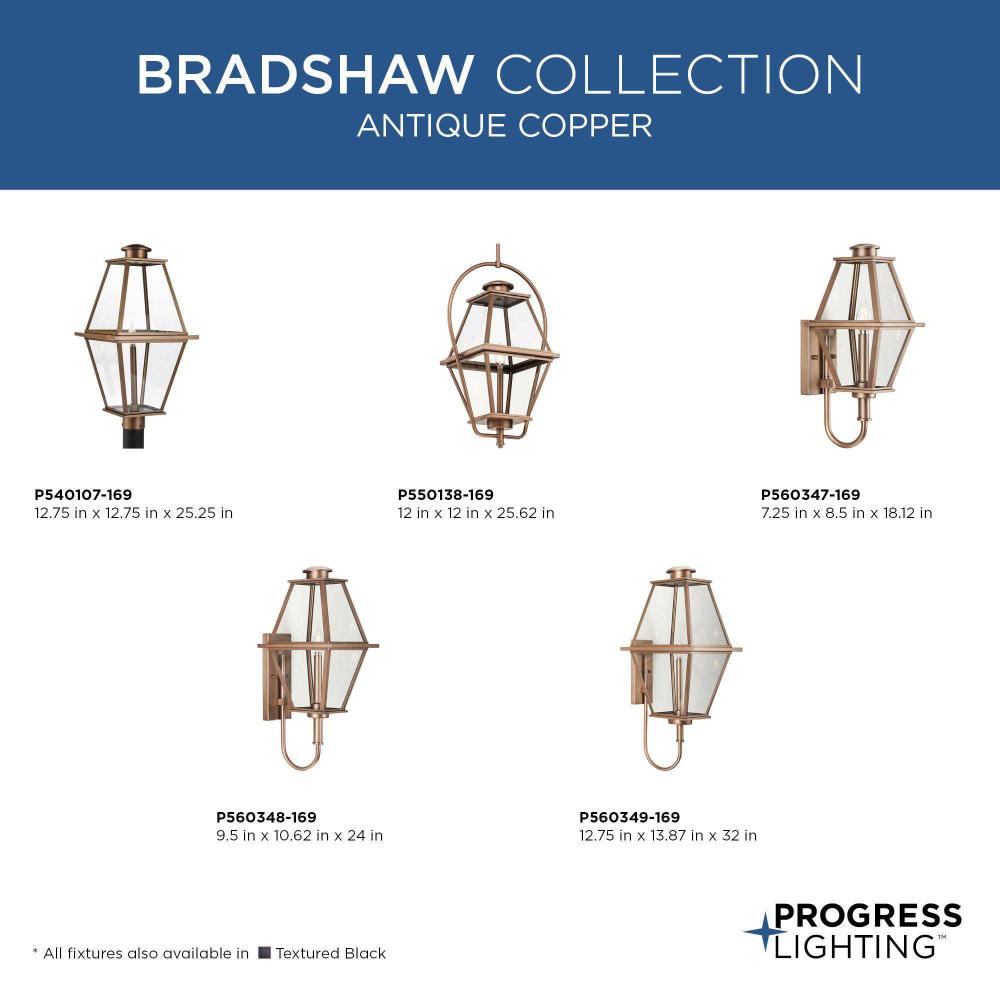 The Bradshaw Collection nods to historical style with its traditional lantern design, beautifully updating a homes curb appeal. A comforting glow is diffused through clear glass panes, creating a warm and romantic ambiance.The gracious lines of this large wall lantern, finished in mellow painted antique copper, elegantly complement exteriors of traditional, transitional and farmhouse settings. It is cULus wet location listed for use where water may be present, with a one-year warranty to guarantee your complete satisfaction. Progress Lighting products are designed for exceptional quality, reliability, and functionality.
