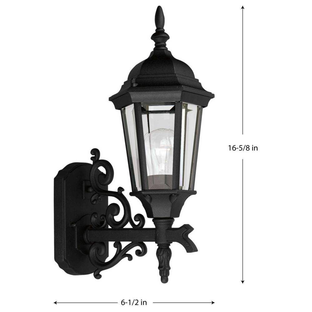 The Welbourne collection features hexagonal framework with vine inspired scrolls and clear beveled glass panels. Cast aluminum construction with durable powder coat finish. One-light 6-1/2 in bottom mount outdoor wall lantern in a Black finish.