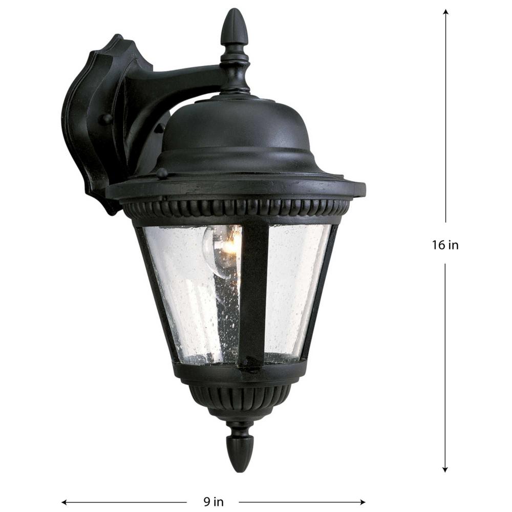 Add a touch of rustic appeal and classic styling with beaded detailing in the Westport collection. Clear seeded glass compliments the durable powder coat finish in die-cast aluminum frames. One-light medium wall lantern. Textured Black finish.