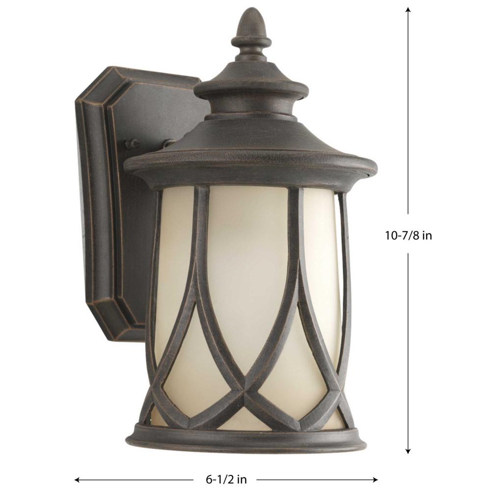 Tudor styling meets prairie design. Gradual umber tint on glass shades. A woven cast pattern encases a casual profile. Large scale cast aluminum lantern feature a durable powder coat finish. One-light small wall lantern.