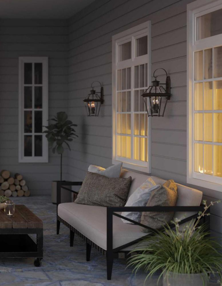 The two-light wall lantern from the Burlington outdoor collection is constructed from aluminum for durable, weather-resistant performance. An Antique Bronze finish complements the clear beveled glass. Open bottom design allows individuals to replace lamps without removing any glass shade.