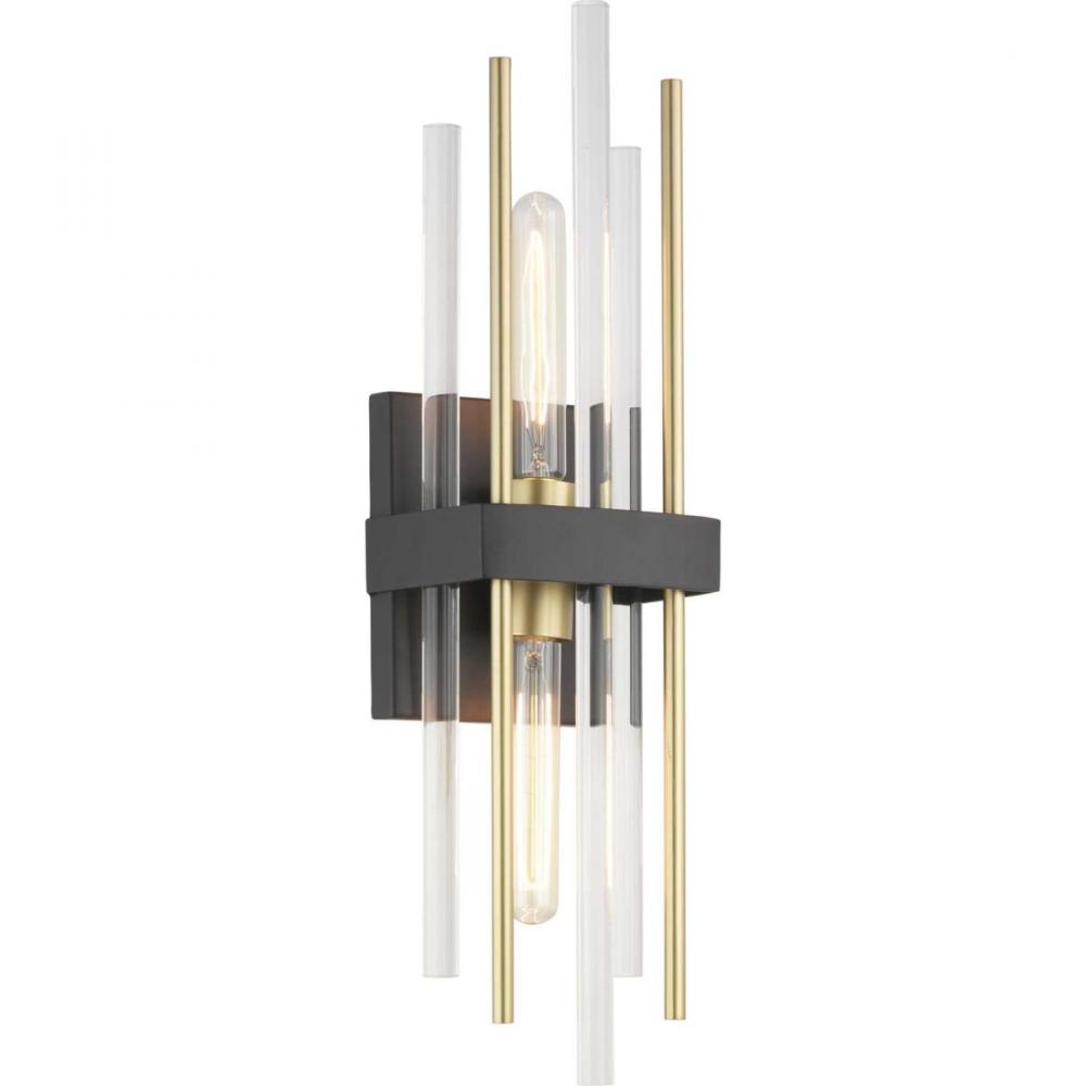 Suitable for sleek and sophisticated interiors, the Orrizo Collection's two-light wall bracket presents an artful arrangement of clear glass and golden metal rods that adorn a Black band. Geometric and artisan design influences complement both Modern and Luxe settings. Common applications for these statement-making fixtures include dining rooms and bedrooms and foyers.