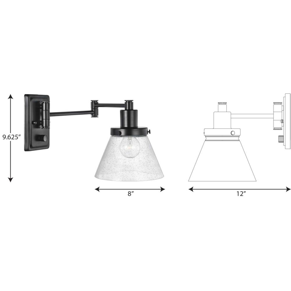 Enjoy focused task lighting with the industrial demeanor of this one-light swing arm wall bracket. A clear seeded glass shade is ready to provide you with focused task light wherever illumination is called upon. The light fixture's signature adjustable arm is coated in a black finish and makes this wall light a favorite choice for when you want to read your favorite novel before bed.