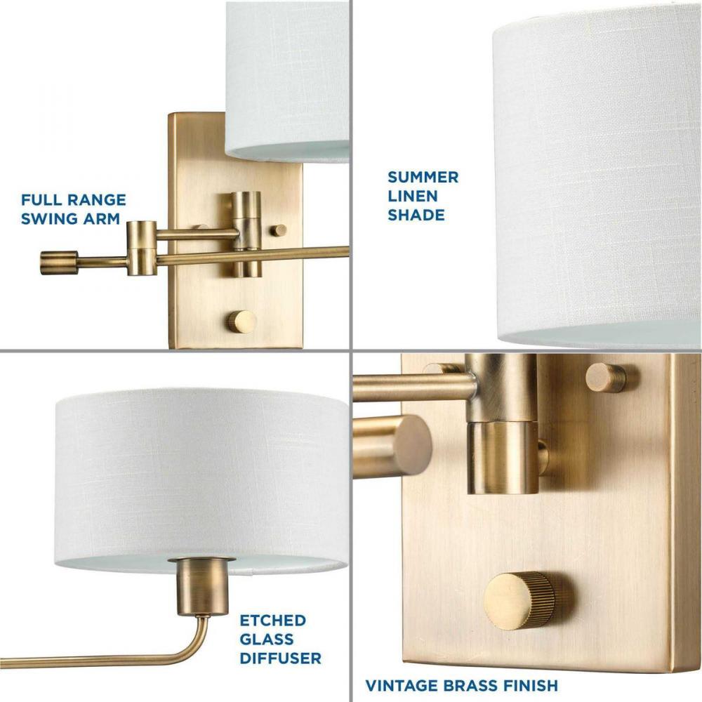 Merge function and fashion with the Carrick Collection. A full-range swing arm supports a crisp summer linen shade and etched glass diffuser for glare-free task illumination. Any integral rotary switch on the backplate is included for convenient control. The wall light's frame is coated in a golden vintage brass finish.