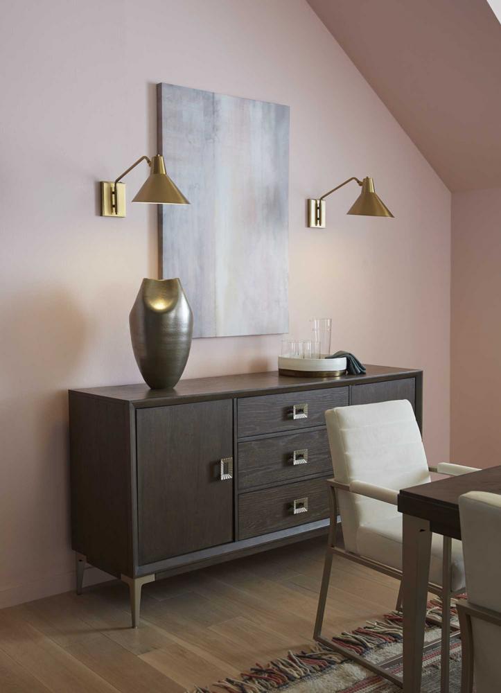 An angular metal shade create a signature design statement in the Trimble Collection Wall Bracket. Its mid-century modern inspiration incorporates a streamlined approach and rich visual details that bring iconic style to open spaces. The opaque metal shade, arm and backplate are finished in subtle brushed bronze. This Wall light is ideal for delivering crisp downlight to bedrooms and living rooms in mid-century modern and luxe industrial settings.