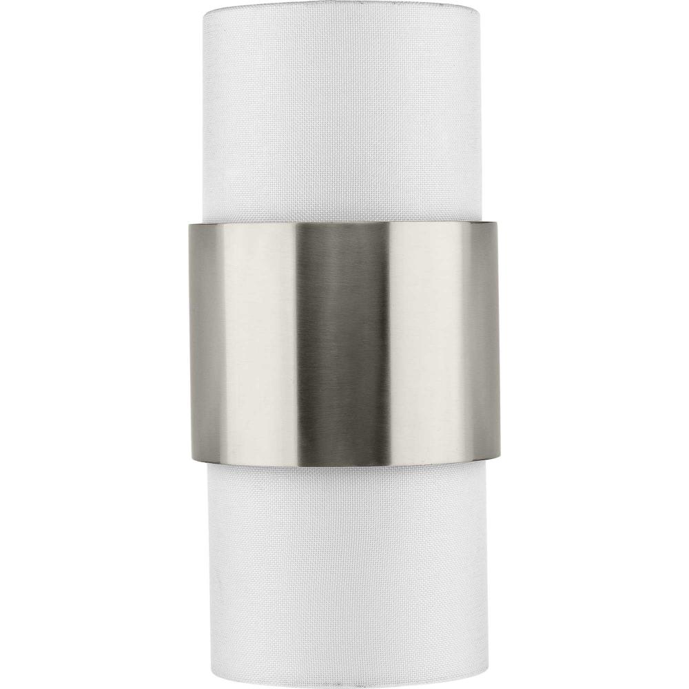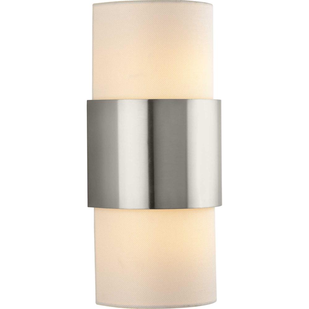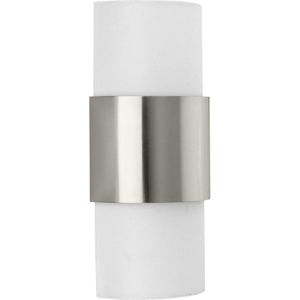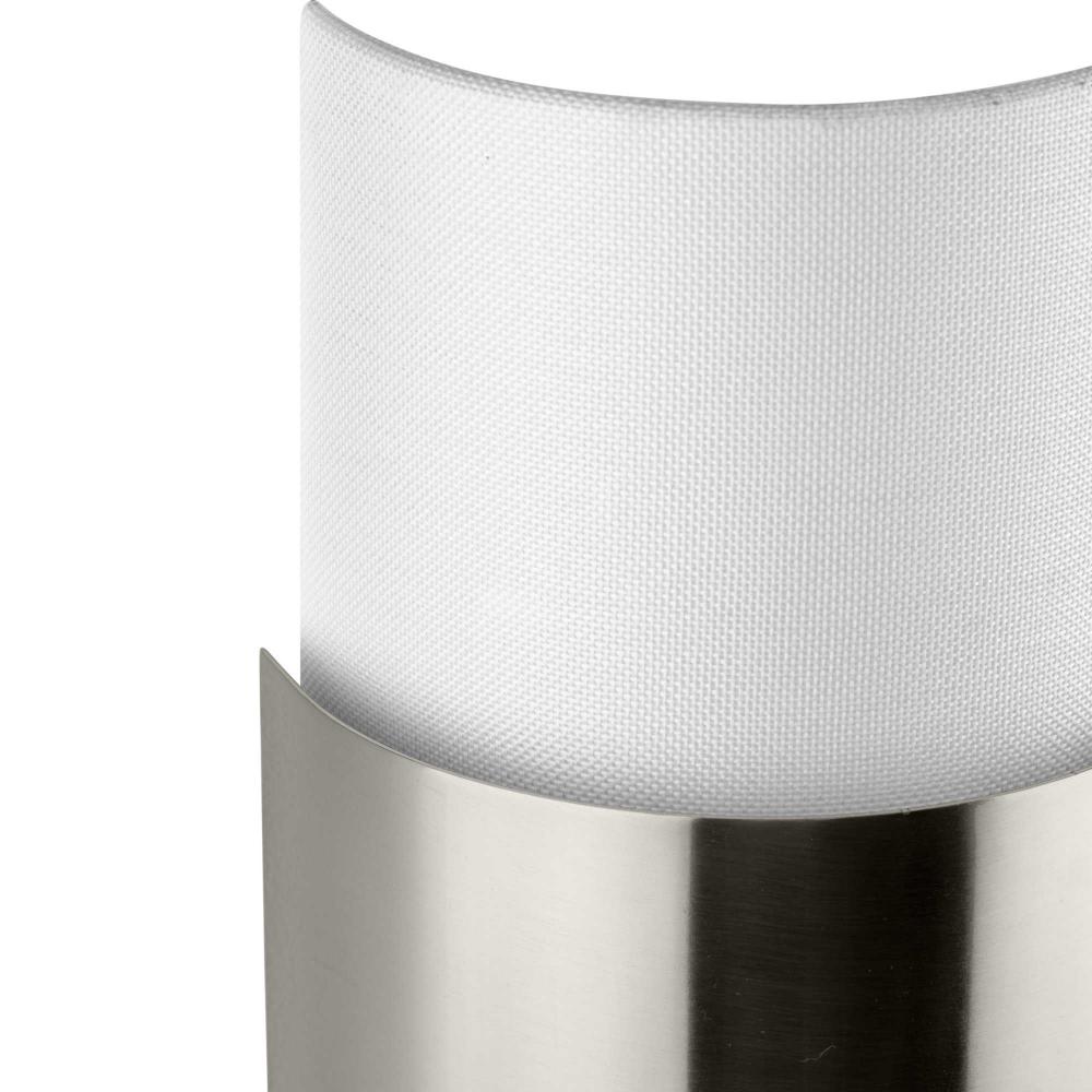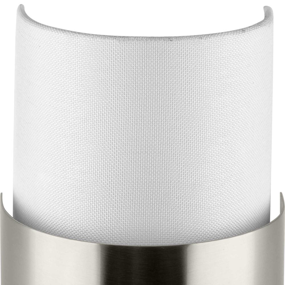 The Silva Collection uses a dramatic contrast of finish and material to present a captivating design. A white linen shade encompassed by a stunning metallic drum coated in a subtle brushed nickel finish establishes a clean, modern, uplifting statement. This fixture is part of the Progress Lighting Design Series, a lighting collection offering fashionable styles and affordable luxury lighting for the home.