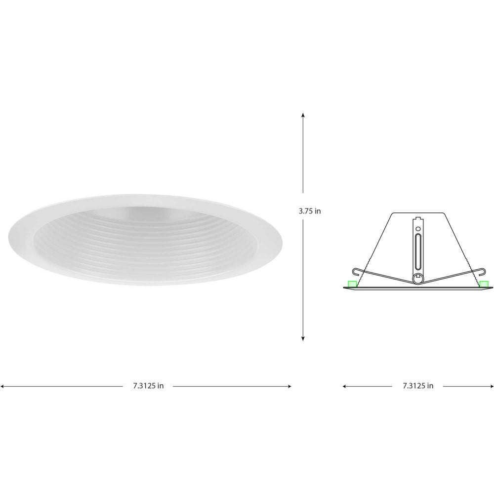 The 6 in. Step Baffle Trim finished in satin white is designed for use in shallow ceilings paired with a shallow height recessed housing. The single-piece aluminum construction eliminates light leaks around the flange and allows it to cover irregular ceiling openings. The surface baffles on the reflector offer a classic look and break-up the lamp reflection producing a more comfortable light. The socket mounts to the trim for optimum performance and consistent lamp position. The integrated torsion springs force trim to fit snugly against the ceiling, providing a secure trim installation and minimizing air leak. UL-CUL damp location rating makes this trim ideal for use in a variety of room settings in conjunction with 6 in. shallow height new construction or remodel recessed housing.
