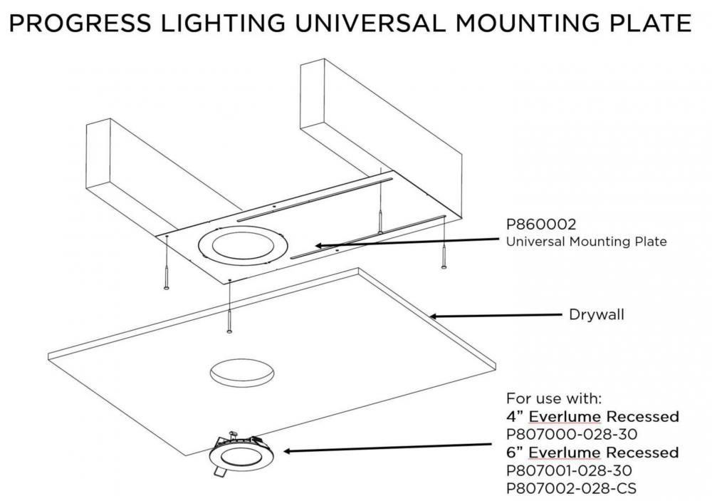 The Universal Installation Mounting Plate Accessory accommodates 4- and 6-inch Progress EverlumeĀ® recessed LED downlights in new construction projects. Crafted of corrosion resistant galvanized steel, the adjustable design features slotted mounting holes for locating the installation hole.