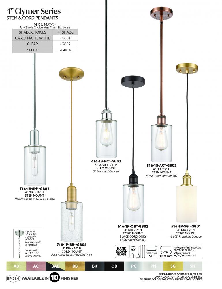 Clear, White & Seedy heavy glass cylinders and a large selection of frame finishes allow the Paladin series to match any decor.