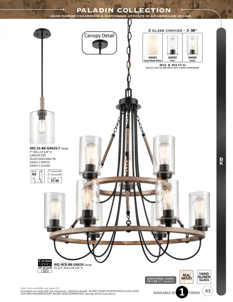 The Paladin collection is comprised of hand carved cedarwood and birchwood accents that give the fixture a farmhouse or lodge look and feel.