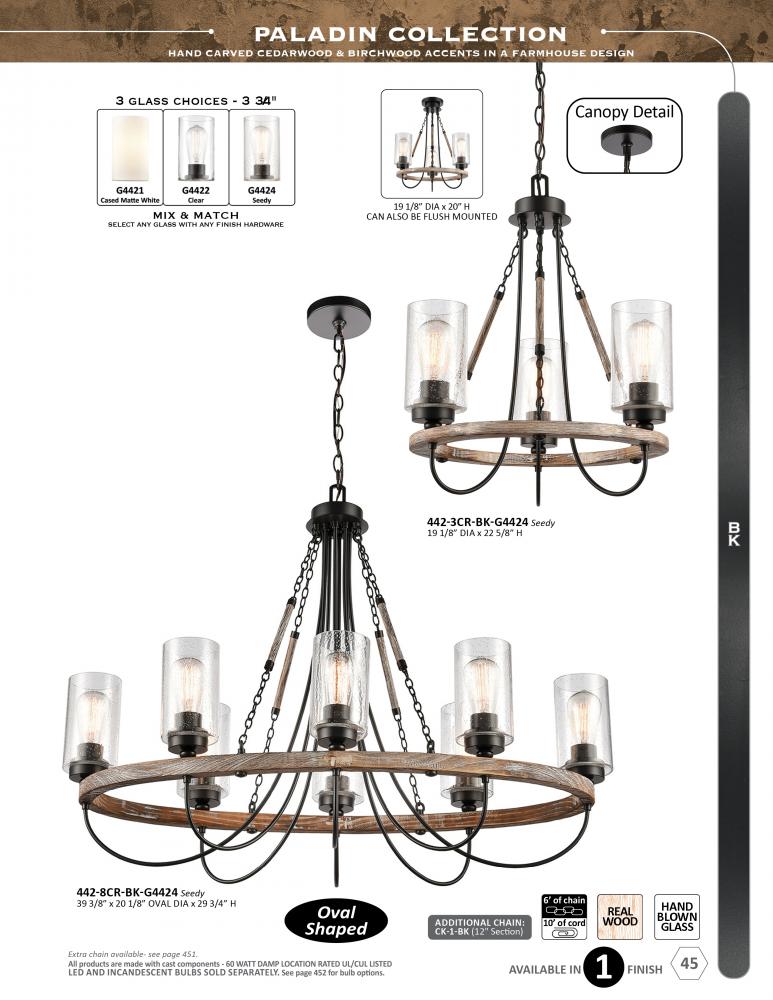 The Paladin collection is comprised of hand carved cedarwood and birchwood accents that give the fixture a farmhouse or lodge look and feel.
