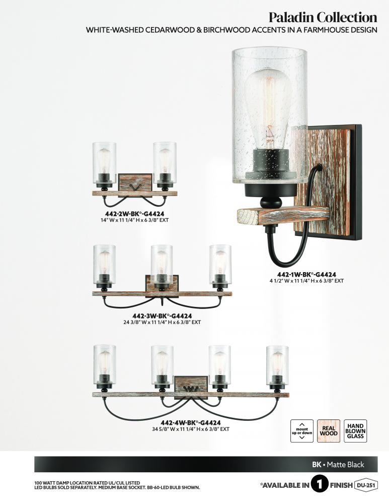 The Paladin collection is comprised of hand carved cedarwood and birchwood accents that give the fixture a farmhouse or lodge look and feel.