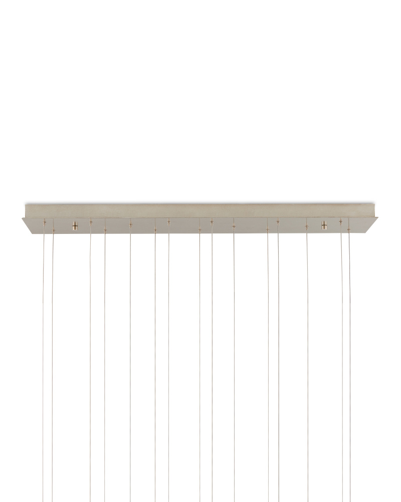 The shades of the Palatino Rectangular 15-Light Multi-Drop Pendant give the impression they are their own complete universes replete with their own Milky Ways. Made of two layers of glass - the interior white and the exterior blue - the shades shimmer with Mica dust that is tossed onto the surface of the molten glass, which is twisted to achieve the swirls that mimic the wonders of the night sky. The surfaces glimmer even when the lights are switched off. The canopy of this piece is luminous in a painted silver finish. This fixture is among Currey & Company's multi-drop pendant collection, which includes multiple configurations.