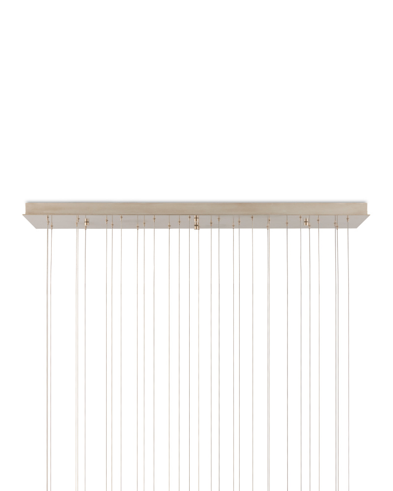 The shades of the Palatino 30-Light Multi-Drop Pendant give the impression they are their own complete universes replete with their own Milky Ways. Made of two layers of glass - the interior white and the exterior blue - the shades shimmer with Mica dust that is tossed onto the surface of the molten glass, which is twisted to achieve the swirls that mimic the wonders of the night sky. The surfaces glimmer even when the lights are switched off. The canopy of this piece is luminous in a painted silver finish. This fixture is among Currey & Company's multi-drop pendant collection, which includes multiple configurations.