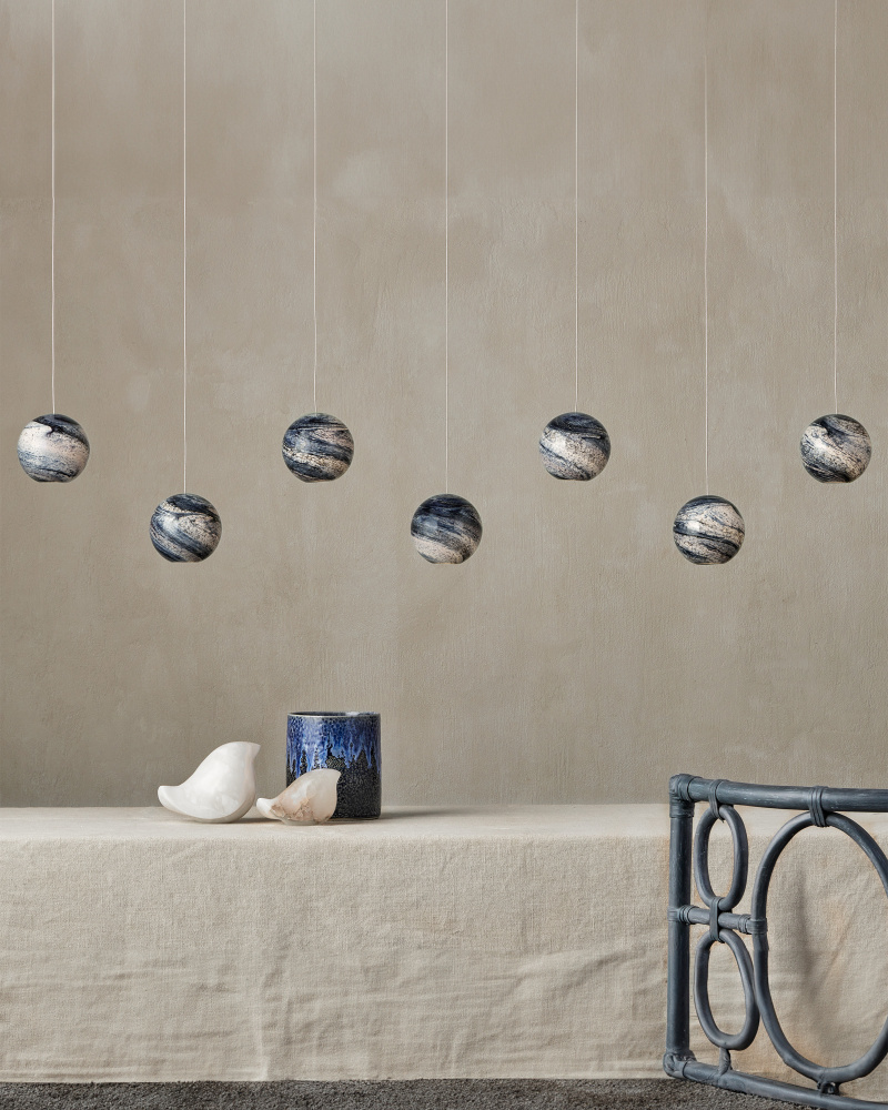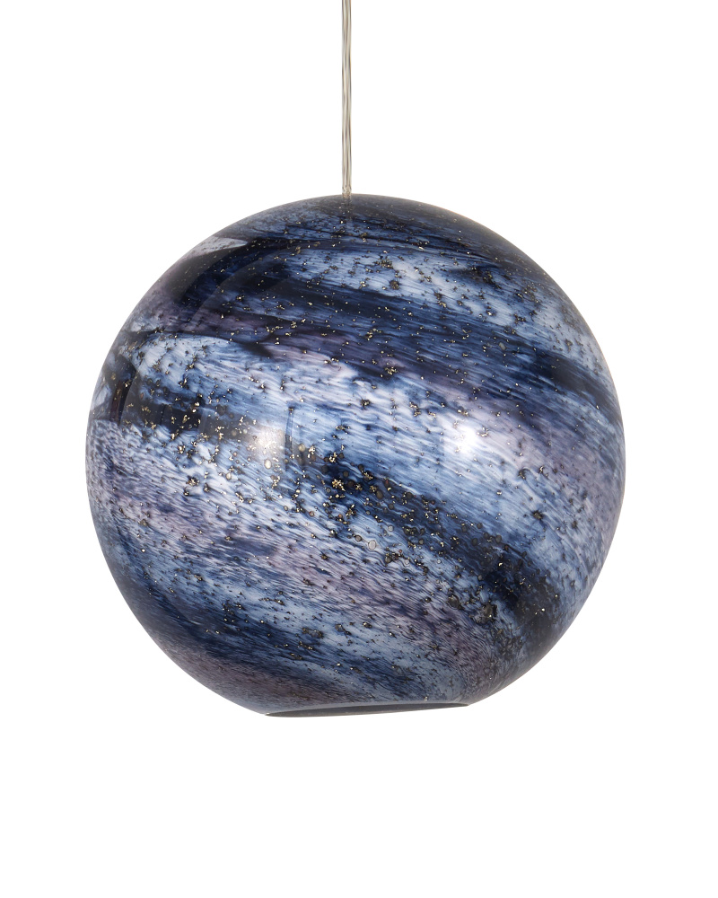 The shades of the Palatino Rectangular 7-Light Multi-Drop Pendant give the impression they are their own complete universes replete with their own Milky Ways. Made of two layers of glass - the interior white and the exterior blue - the shades shimmer with Mica dust that is tossed onto the surface of the molten glass, which is twisted to achieve the swirls that mimic the wonders of the night sky. The surfaces glimmer even when the lights are switched off. The canopy of this piece is luminous in a painted silver finish. This fixture is among Currey & Company's multi-drop pendant collection, which includes multiple configurations.