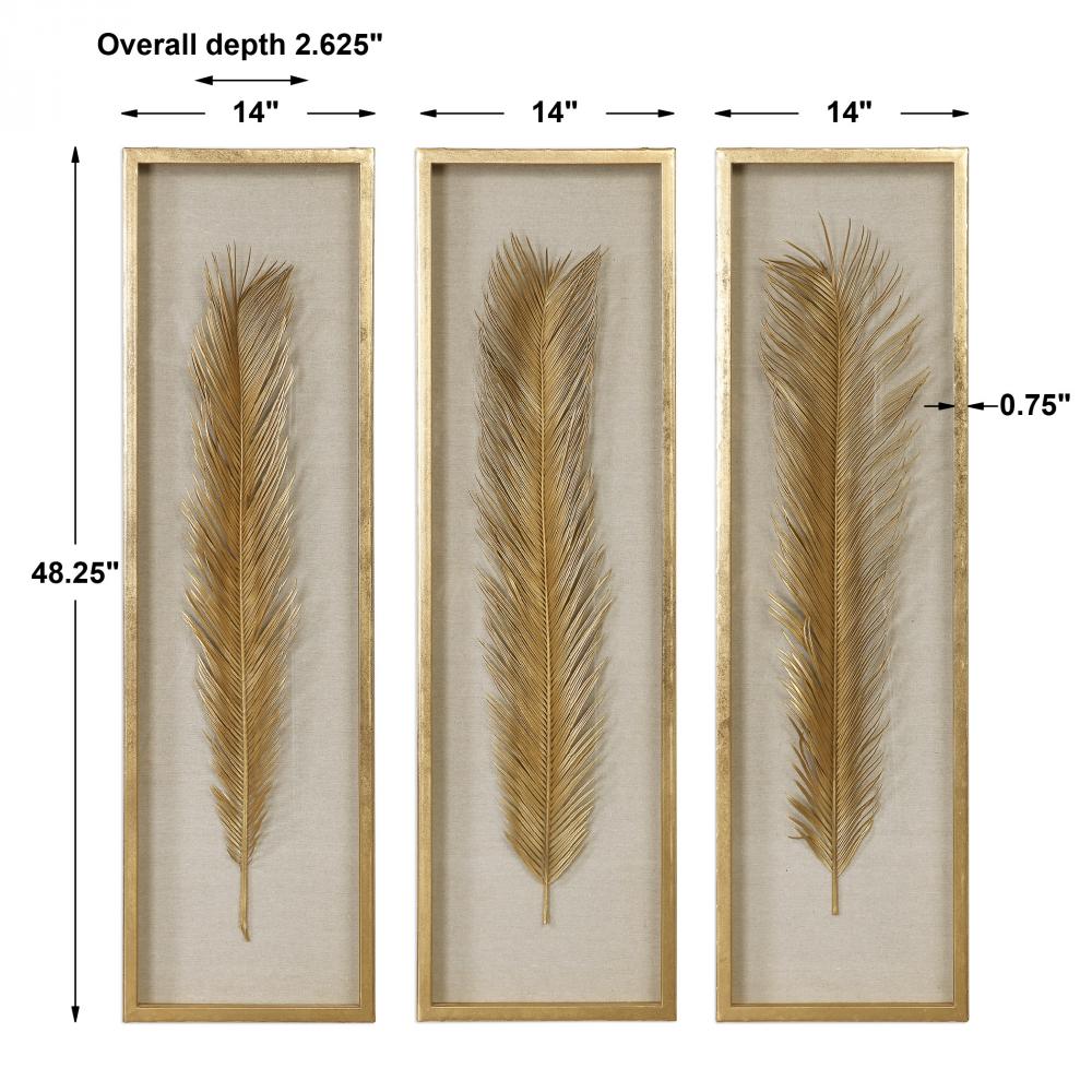 This Set of 3 Shadow Box Art Features Gold Finished Sago Palm Leaf Replicas, Set on A Neutral Linen Background with Hand Applied Gold Leaf Frames.